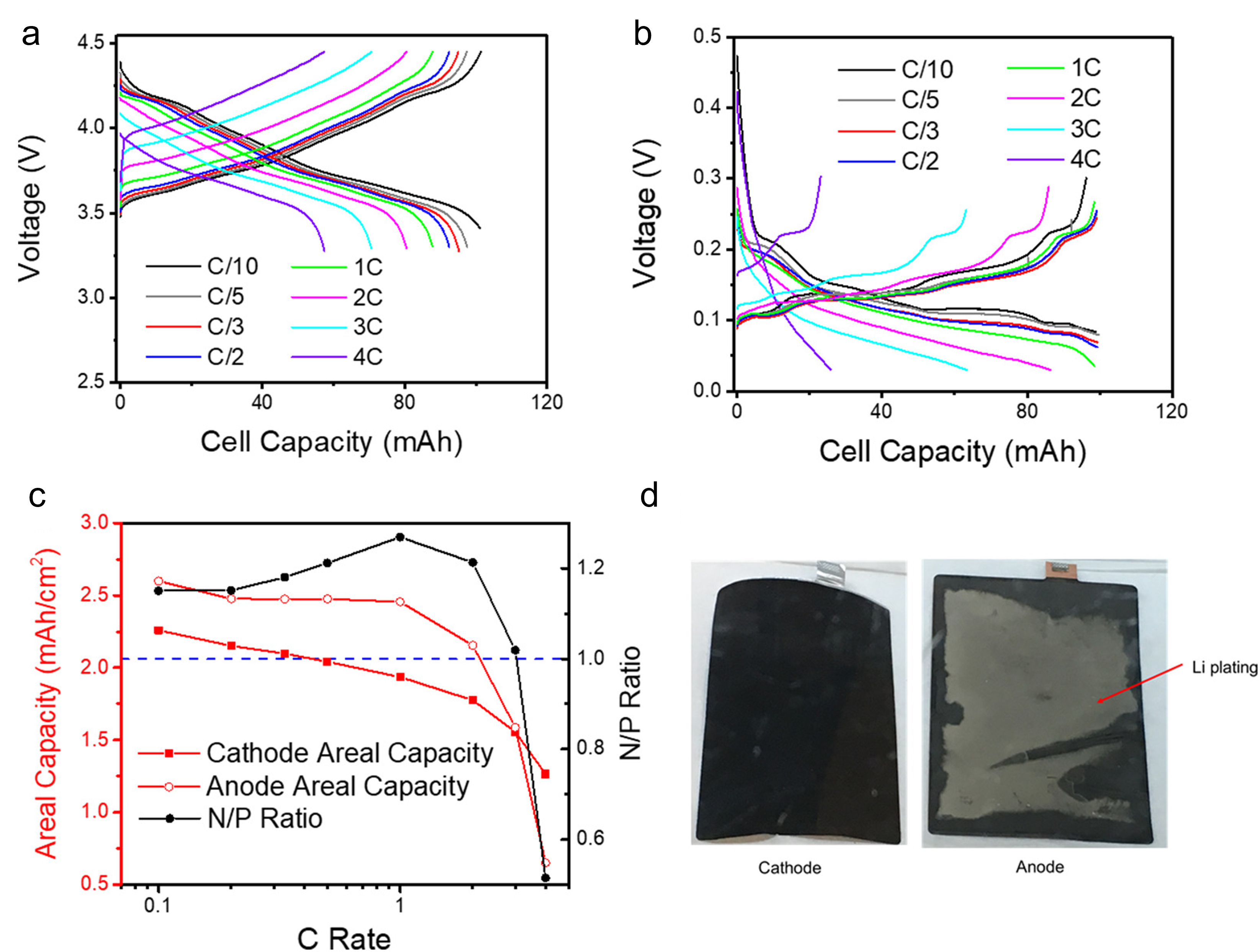 图2 (a) 对称电池中NMC811正极的电压分布, 电极在C/5下锂化,以不同的速率去锂化;(b) 对称电池中石墨负极的电压分布, 电极在C/5时脱锂, 并以不同的速率锂化;(c) NMC 811正极和石墨负极在不同速率下的面积容量以及由此产生的N/P比;(d) 来自NMC 811||石墨全电池的电极在充电速率性能测试后的图像[26]Fig.2 (a) Voltage profiles of NMC811 in the cathode symmetric cell. The electrode was lithiated at C/5 and delithiated at various rates. (b) Voltage profiles of graphite in the anode symmetric cell. The electrode was delithiated at C/5 and lithiated at various rates. (c) Areal capacity of the NMC811 cathode and graphite anode at each rate and the resulting N/P ratio. (d) Images of electrodes from the NMC811/Graphite full cell after charging rate performance test. Reproduced with permission[26]. Copyright 2018, Elsevier |