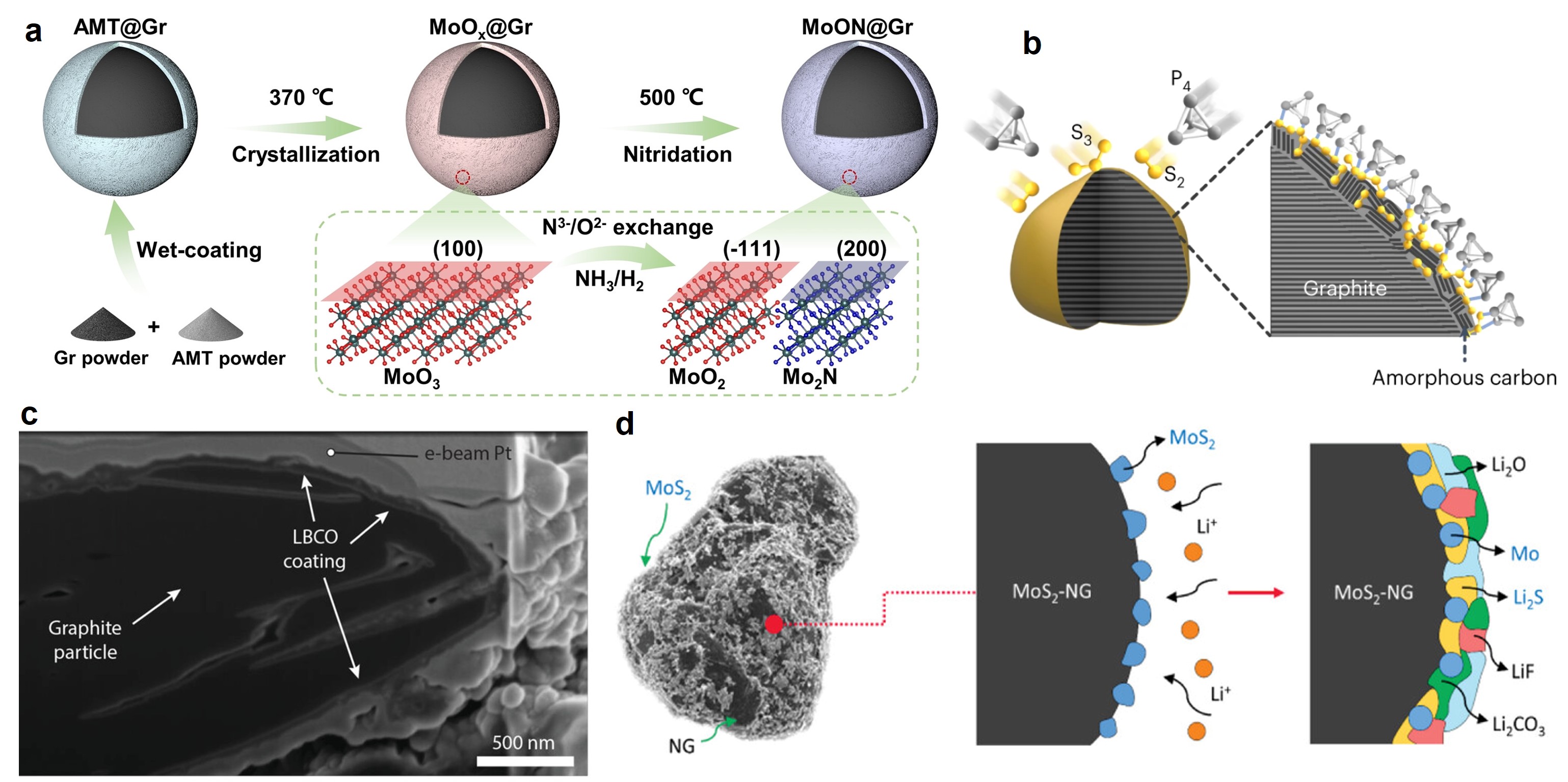 图4 (a) MoON@Gr合成示意图[35];(b) P-S-石墨形成机制示意图[36];(c) 聚焦离子束穿过单个LBCO包覆石墨颗粒的横剖面的SEM图像[37];(d) MoS2包覆石墨的SEI形成示意图[38]Fig. 4 (a) Synthetic schematic diagram of MoON@Gr. Reproduced with permission[35]. Copyright 2024, Wiley; (b) schematic of the formation mechanism of P-S-graphite. Reproduced with permission[36]. Copyright 2023, Springer Nature. (c) SEM image of focused-ion beam cross-section through a single graphite particle showing the conformal LBCO encapsulation of the particle. Reproduced with permission[37]. Copyright 2022, Wiley. (d) Schematic description of the SEI composition and reaction coordinates for MoS2-NG.; Reproduced with permission[38].Copyright 2025, Wiley |