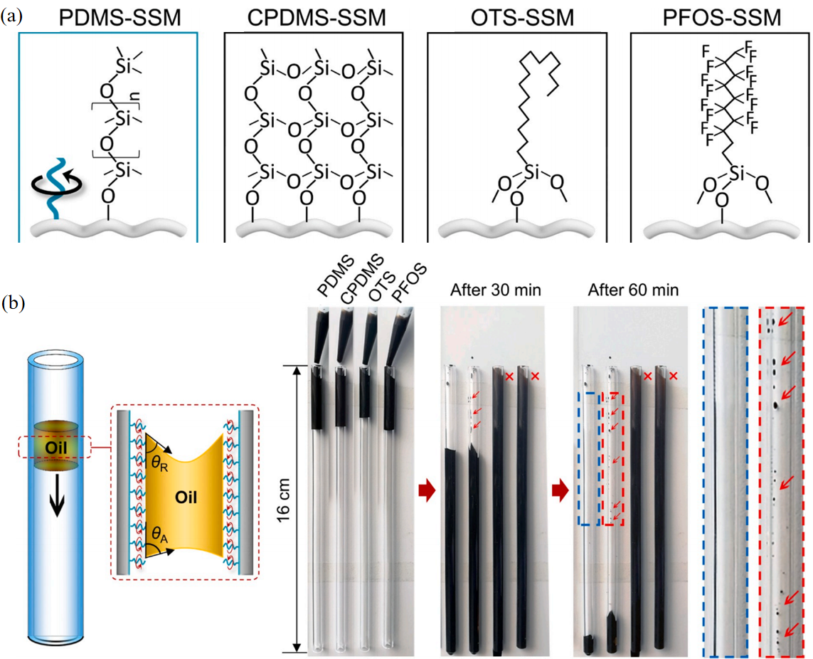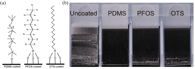图10 类液体表面在防结垢中的应用。(a) 分别在涂层表面接枝PDMS、全氟烷基硅烷(PFOS)和十八烷基三氯硅烷(OTS)的示意图[104];(b) 涂层表面接枝PDMS、全氟烷基硅烷(PFOS)和十八烷基三氯硅烷(OTS)的防结垢测试效果图[104]Fig.10 Application of liquid-like surfaces in anti-fouling. (a) Schematic diagram of grafting PDMS, perfluoroalkylsilane (PFOS), and octadecyltrichlorosilane (OTS) onto coated surfaces, respectively[104]; (b) anti-fouling test results of coated surfaces grafted with PDMS, perfluoroalkylsilane (PFOS), and octadecyltrichlorosilane (OTS)[104] |
