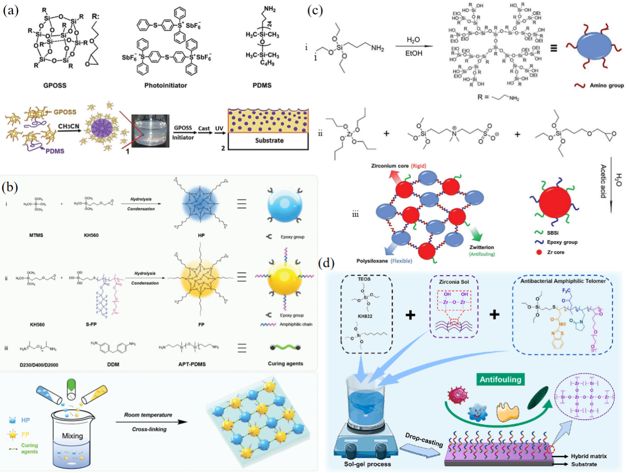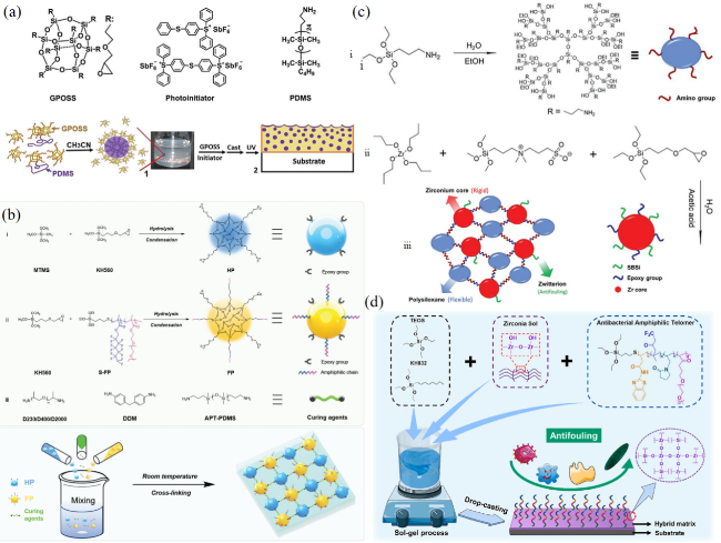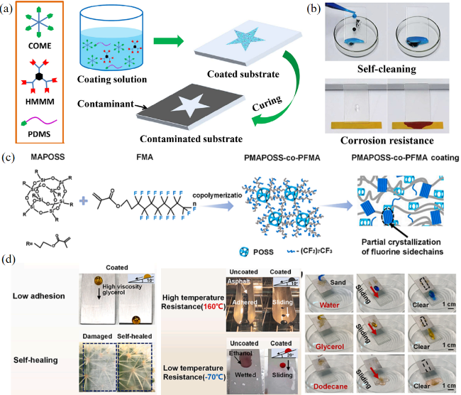 图6 类液体表面在自清洁中的应用。(a) 类液体涂层的制备过程示意图[95];(b) 类液体涂层的自清洁效果图[95];(c) MAPOSS-co-PFMA的制备及其侧氟链的部分结晶示意图[96];(d) MAPOSS-co-PFMA涂层低附着力、自愈合、耐高低温和自清洁效果图[96]Fig.6 Applications of liquid-like surfaces in self-cleaning. (a) Schematic diagram of the synthesis of liquid-like coatings[95]; (b) self-cleaning effect diagram of type liquid coating[95]; (c) preparation of MAPOSS-co-PFMA and partial crystallization diagram of its side fluorine chain[96]; (d) effect diagram of low adhesion, self-healing, resistance to high and low temperatures and self-cleaning of MAPOSS-co-PFMA coating[96] |