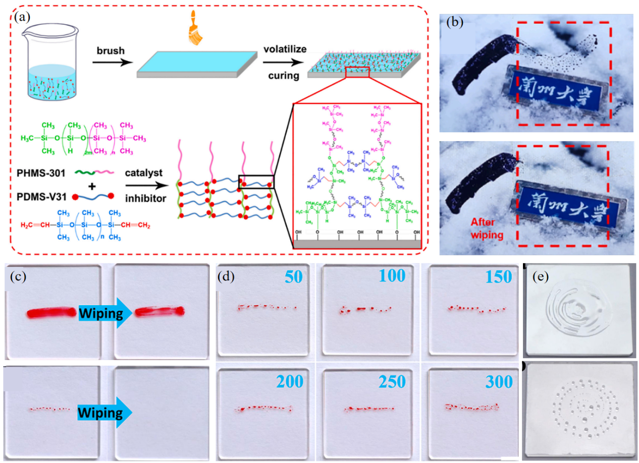 图7 类液体表面在防涂鸦及耐指纹中的应用。(a) 防涂鸦涂层的形成机理图[97];(b) 在玻璃基材上的防涂鸦效果图[97];(c) 油墨在裸玻璃和经涂层处理的玻璃表面的收缩痕迹和经纸巾擦拭后的效果图[98];(d) 油墨分别在50、100、150、200、250和300次书写和擦除循环后的表面收缩状态[98];(e) 人工指纹液在裸玻璃和经涂层处理的玻璃表面的收缩状态[98]Fig.7 The application of liquid-like surfaces in anti-graffiti and anti-fingerprint properties. (a) Formation mechanism diagram of anti-graffiti coating[97]; (b) anti-graffiti effect drawing on glass substrate[97]; (c) the shrinkage marks of the ink on bare glass and coated glass surfaces and the effect drawing after wiping with paper towels[98]; (d) the surface shrinkage states of the ink after 50, 100, 150, 200, 250 and 300 writing and erasing cycles respectively[98]; (e) the contraction state of artificial fingerprint liquid on bare glass and coated glass surfaces[98] |