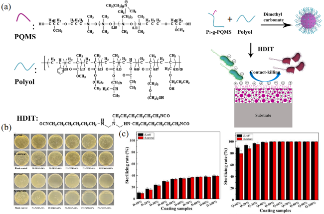 图8 类液体表面在抗生物膜黏附中的应用。(a) PQMS、多元醇、HDIT的化学结构式及形成PU-PQMS涂层后对抗生物膜黏附的机理图[101];(b) PU-PDMS和PU-PQMS涂层对大肠杆菌和金黄色葡萄球菌的抗菌效果图[101];(c) PU-PDMS和PU-PQMS涂层对大肠杆菌和金黄色葡萄球菌的抗菌率[101]Fig.8 The application of liquid-like surfaces in anti-biofilm adhesion. (a) The chemical structural formulas of PQMS, polyols and HDIT and the mechanism diagrams of anti-biofilm adhesion after the formation of PU-PQMS coating[101]; (b) antibacterial effect diagrams of PU-PDMS and PU-PQMS coatings on Escherichia coli and Staphylococcus aureus[101]; (c) the antibacterial rates of PU-PDMS and PU-PQMS coatings against Escherichia coli and Staphylococcus aureus[101] |