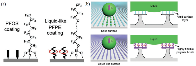 图9 类液体表面在液体定向传输中的应用。(a) 分别在涂层表面接枝全氟辛基硅烷(刚性结构)和全氟聚醚(柔性结构)示意图[102];(b) 液滴在全氟辛烷硅烷(刚性结构)和全氟聚醚(柔性结构)表面微观运输机理图[102]Fig.9 The application of liquid-like surfaces in liquid directional transmission. (a) Schematic diagram of grafting perfluorooctane silane (rigid structure) and perfluoropolyether (flexible structure) on the coating surface respectively[102]; (b) microscopic transport mechanism diagram of liquid droplets on the surface of perfluorooctane silane (rigid structure) and perfluoropolyether (flexible structure)[102] |