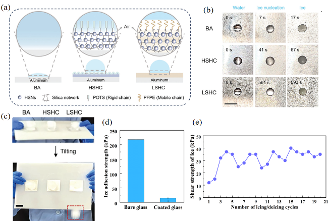图5 类液体表面在防结冰中的应用。(a) HSHC和LSHC涂层的防冰机理图[92];(b) BA、HSHC和LSHC涂层的冰冻结过程效果图[92];(c) BA、HSHC和LSHC涂层冰黏附力的对比图[92];(d) 冰在裸玻璃和光滑涂层表面的黏附强度[93];(e) 冰在光滑涂层上的黏附强度随结冰循环的变化[93]Fig.5 The application of liquid-like surfaces in anti-icing. (a) Anti-icing mechanism diagrams of HSHC and LSHC coatings[92]; (b) effect diagram of the ice freezing process of BA, HSHC and LSHC coatings[92]; (c) comparison chart of ice adhesion force of BA, HSHC and LSHC coatings[92]; (d) the adhesion strength of ice on bare glass and smooth coating surfaces[93]; (e) the variation of the adhesion strength of ice on smooth coatings with the freezing cycle[93] |