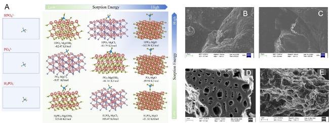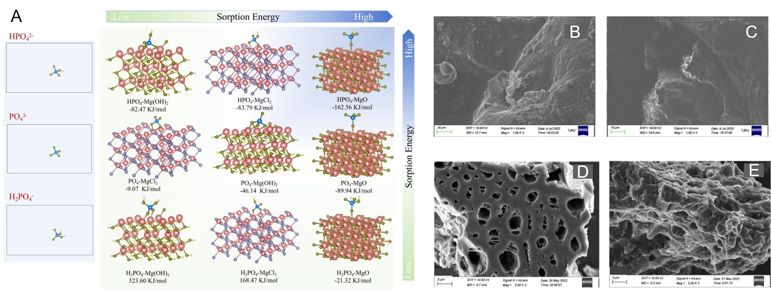 图4 (A) Mg@ABB的DFT计算[61];不同材料的SEM图对比:(B) 原始玉米芯生物炭[62];(C) CaCl2改性玉米芯生物炭[62];(D) 原始荞麦壳生物炭[64];(E) CaCl2改性荞麦壳生物炭[64]Fig.4 (A) DFT calculations of Mg@ABB[61]; comparison of SEM images of different materials: (B) pristine corn cob biochar[62]; (C) CaCl2-modified corn cob biochar[62]; (D) pristine buckwheat hull biochar[64]; (E) CaCl2-modified buckwheat hull biochar[64] |