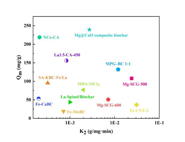 图5 基于Langmuir模型的金属基吸附剂最大吸附量与伪二级动力学系数的比较:Mg-SCG-500[74],Mg-SCG-600[74],SA-KBC-Fe/La[75],Fe-MnBC[76],Fe-CNT-2[77],MBA/AlCl3[78],La-Spinel/Biochar[79],NCo-CA[80],Mg@CaO composite biochar[81],MPG-BC 1:1[82],Fe-CaBC[83],La3.5-CA-450[84]Fig.5 Comparison of the maximum adsorption capacity from the Langmuir model and pseudo-second order kinetic coefficients of reported metal-based adsorbents: Mg-SCG-500[74], Mg-SCG-600[74], SA-KBC-Fe/La[75], Fe-MnBC[76], Fe-CNT-2[77], MBA/AlCl3[78], La-Spinel/Biochar[79], NCo-CA[80], Mg@CaO composite biochar[81], MPG-BC 1:1[82], Fe-CaBC[83], La3.5-CA-450[84] |