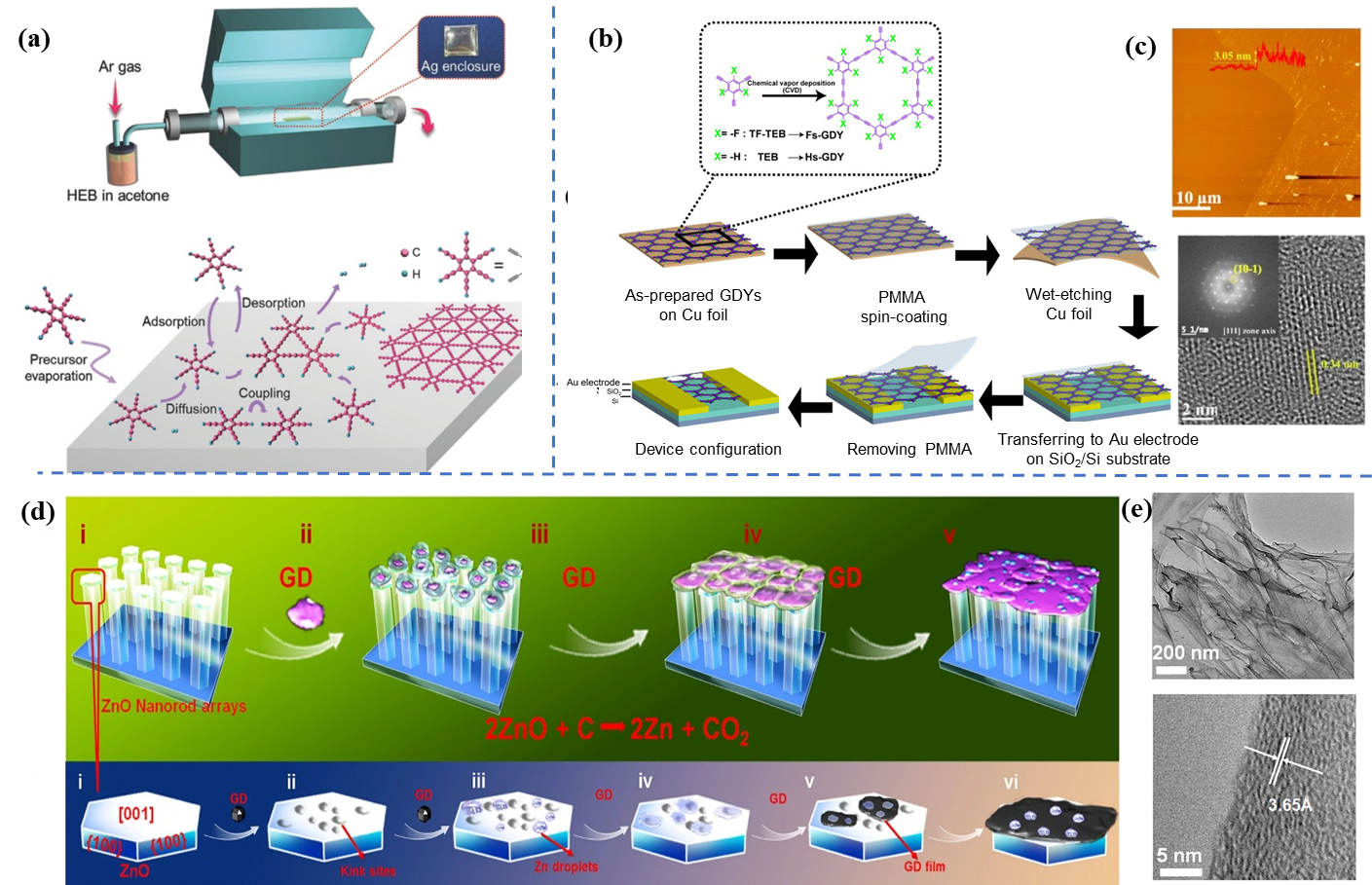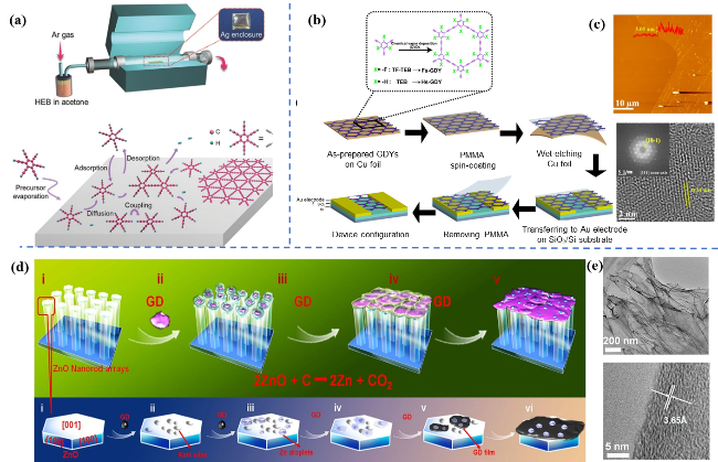 图3 (a) 化学气相沉积法制备GDY[51];(b) 化学气相沉积法制备F-GDY/H-GDY[52];(c) F-GDY的AFM和HRTEM图像[53];(d) ZnO纳米阵列上沉积GDY薄膜示意图和(e) TEM和HRTEM图像[54]Fig.3 (a) Schematic diagram of GDY synthesized by CVD method[51]; (b) schematic diagram of F-GDY/H-GDY synthesized by CVD method[52]; (c) AFM and HRTEM images of F-GDY[53]; (d) schematic diagram of GDY thin films deposited on ZnO nano-arrays; (e) TEM and HRTEM images of GDY thin films[54] |