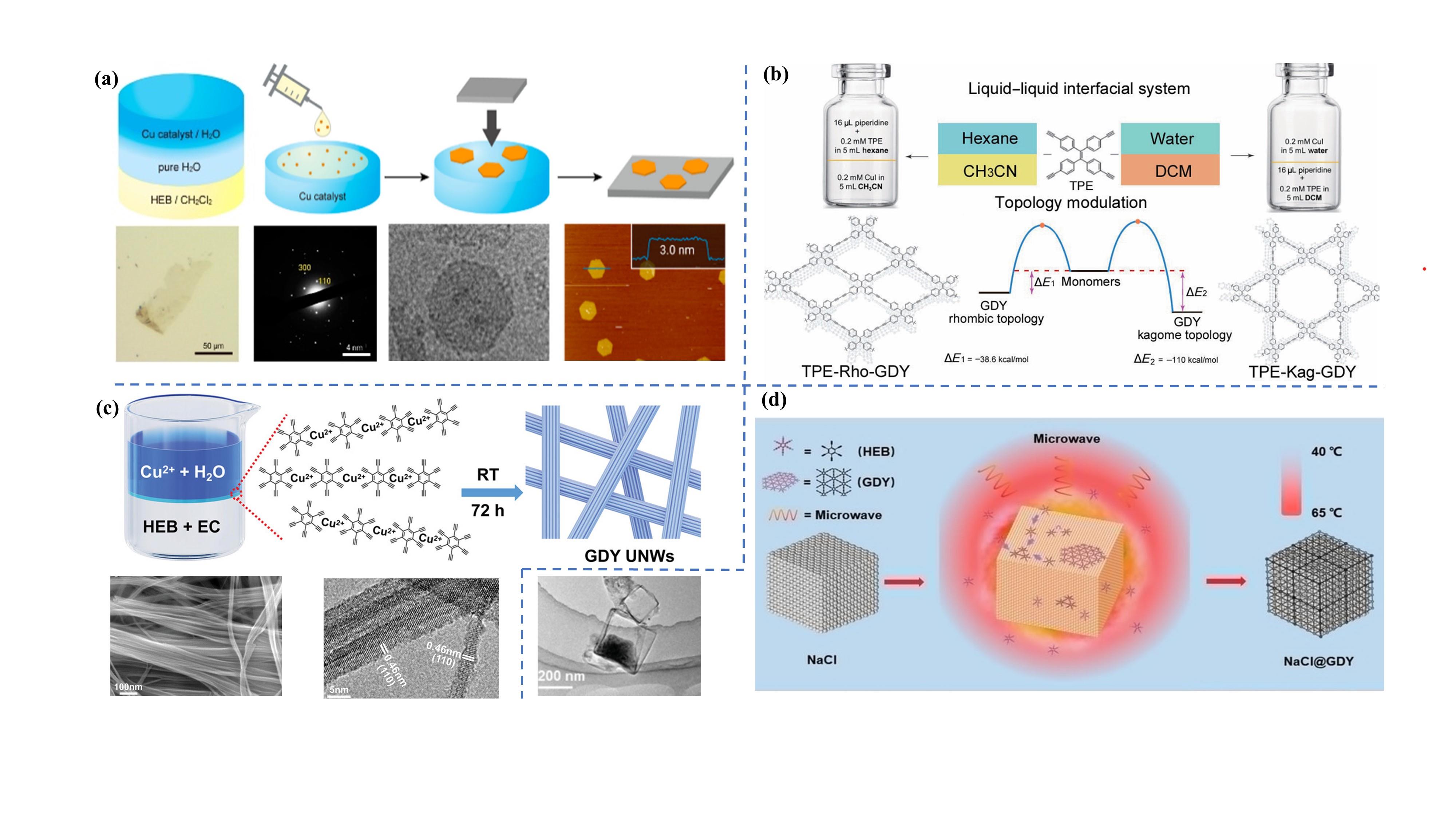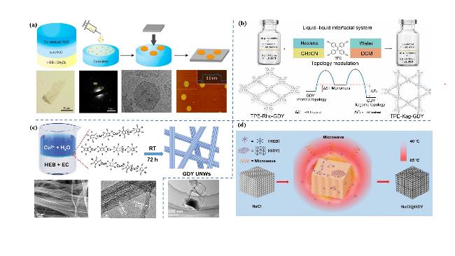 图5 (a) GDY液-液/气-液界面法示意图及电镜表征结果[58];(b) 两种拓扑结构TPE-GDY的液/液界面法示意图[59];(c) GDY纳米线合成示意图及电镜表征结果[60];(d) 固/液界面温度梯度驱动合成GDY[61]Fig.5 (a) Schematic diagram and electron microscope characterization of GDY by liquid-liquid/gas-liquid interfacial method[58]; (b) schematic diagram of liquid/liquid interface method for two topologies of TPE-GDY[59]; (c) schematic diagram and electron microscopy characterization of GDY nanowires[60]; (d) temperature gradient-driven synthesis of GDY at solid/liquid interfaces[61] |