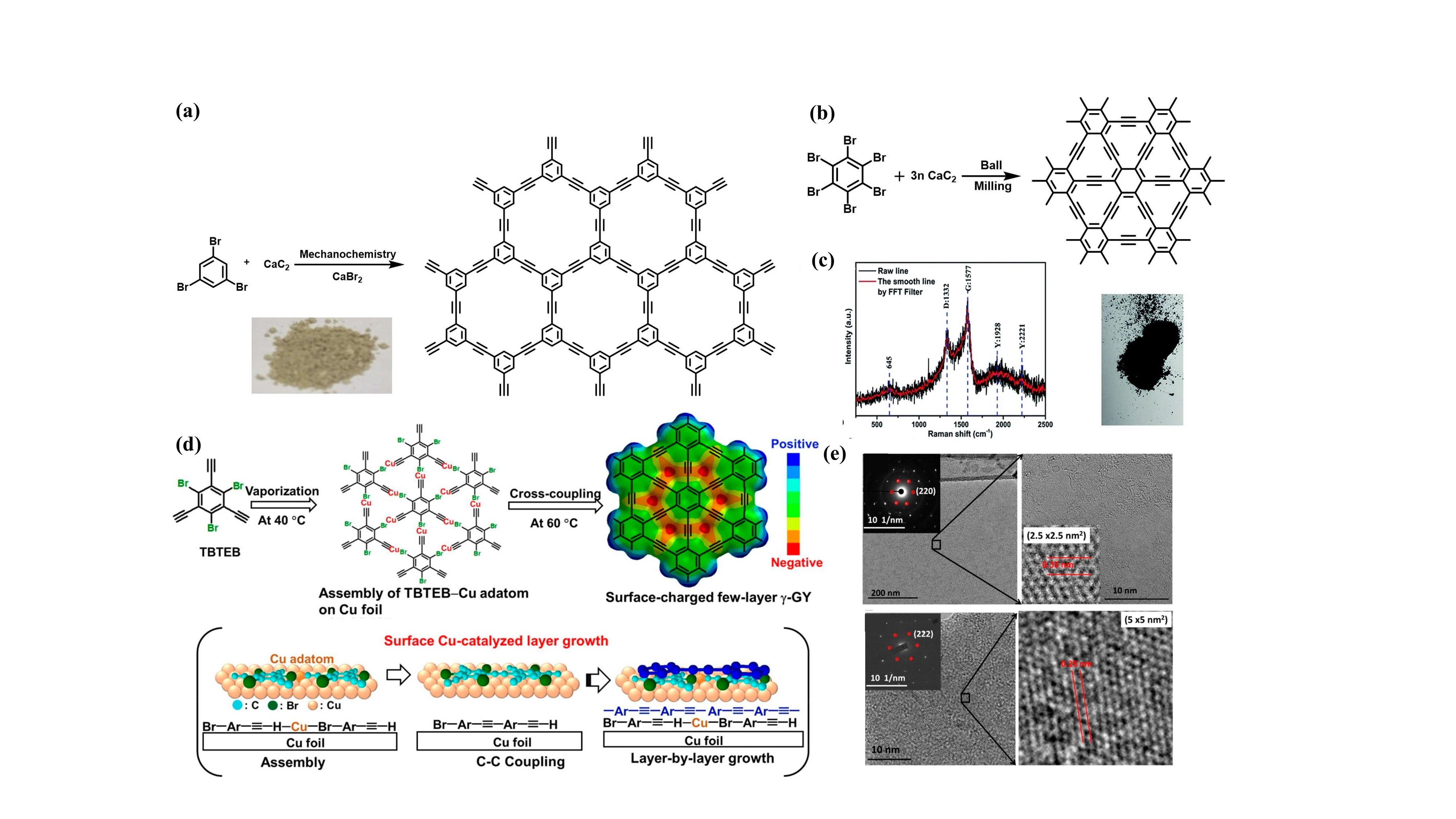 图7 (a) 机械球磨法合成H-GY[63];(b) 机械球磨法合成GY[64];(c) GY的拉曼光谱和粉末照片[64];(d) CVD法合成GY反应示意图及(e)HRTEM图谱(插图为SAED图谱)[66]Fig.7 (a) Synthesis of H-GY by mechanical ball milling[63]; (b) synthesis of GY by mechanical ball milling[64]; (c) Raman spectrum and powder photographs of GY[64]; (d) schematic illustration of the synthesis of GY by CVD method and (e) HRTEM images (inset are SAED images)[66] |