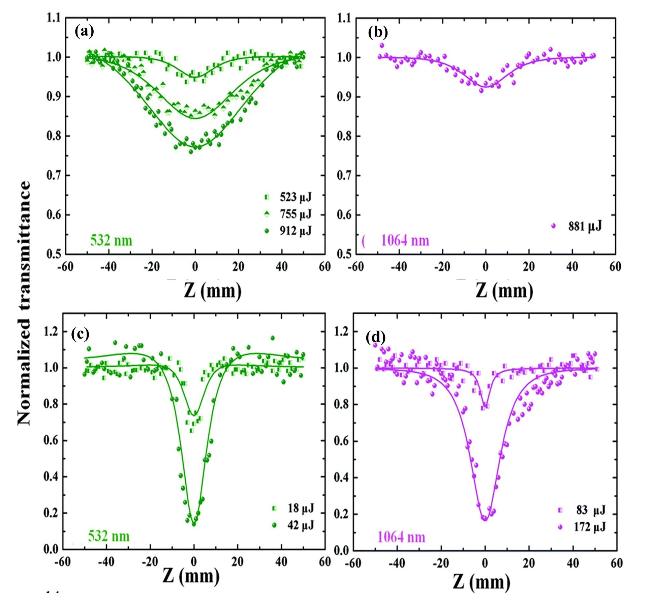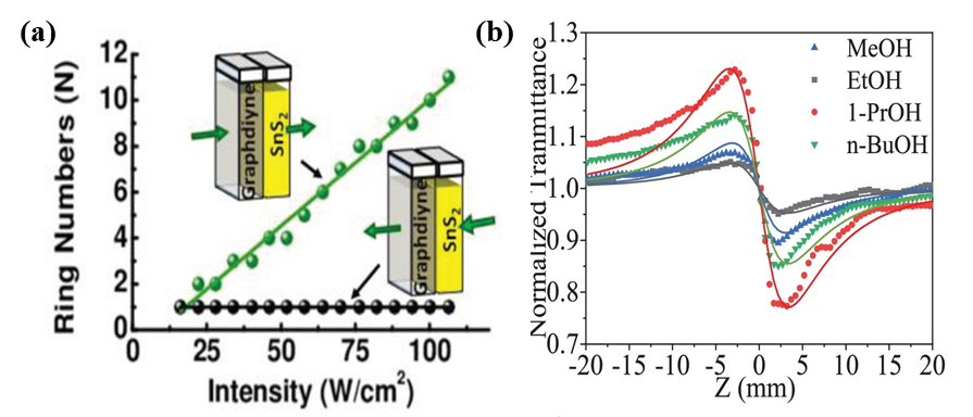 图11 (a) GDY/SnS2光子二极管示意图[83];(b) GDY在不同溶剂中归一化透射率的Z扫描曲线和理论拟合[17]Fig.11 (a) Schematic diagram of non-reciprocal light propagation phenomena in GDY/SnS2 photodiode[83]; (b) experimental results and theoretical fits of short aperture Z-scan curves of normalized transmittance of GDY dispersions in different solvents[17] |