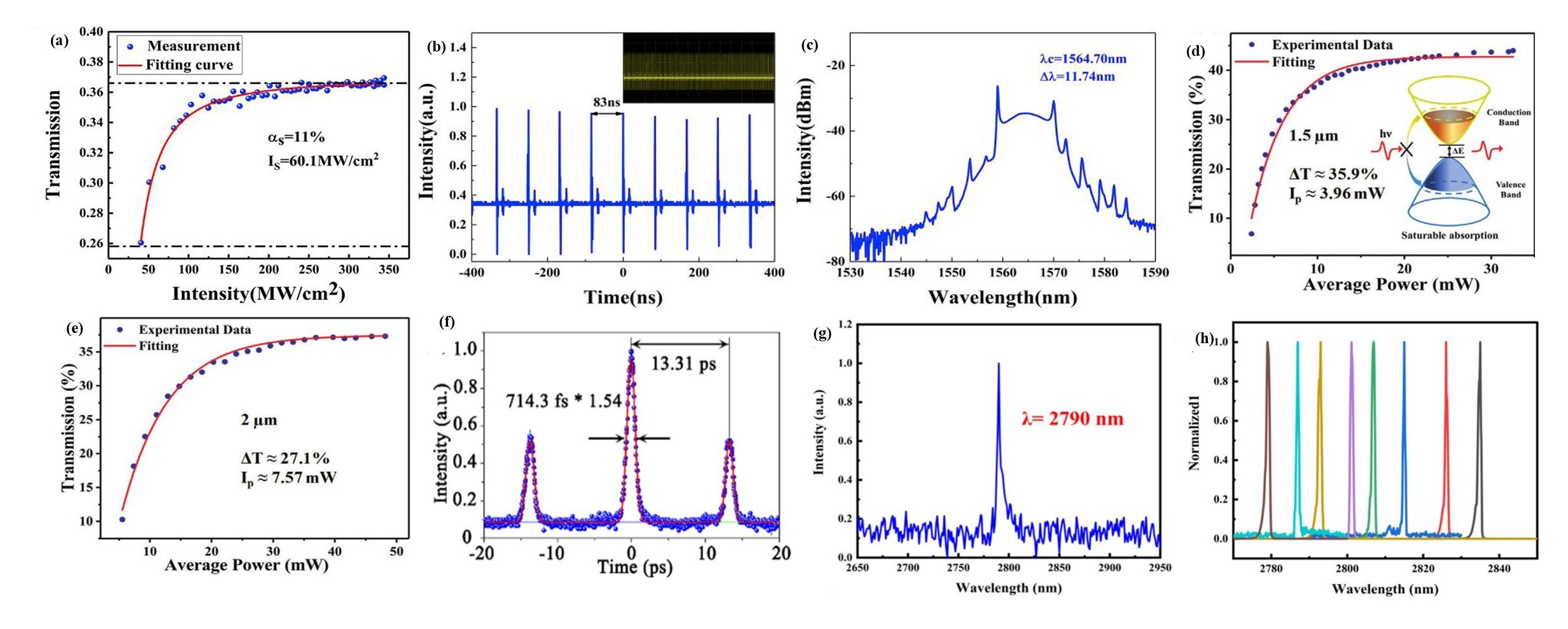 图12 (a) GDY非线性传输和拟合曲线;GDY锁模光纤激光器的(b)输出脉冲串和(c)光谱学[88];GDY SA光纤器件在(d)1.5 µm,(e) 2 µm处的非线性能量依赖传输曲线[89];(f) GDY-PMMA混合锁模光纤激光器的自相关轨迹[90];(g, h) GDY SA光纤激光器的输出频谱及可调谐脉冲激光器的输出光谱[91]Fig.12 (a) Nonlinear transmission and fitting curves of GDY; (b) output pulse train and (c) spectroscopy of a GDY based mode-locked fiber laser[88]; nonlinear energy-dependent transmission curves of a GDY SA fiber device (d) at 1.5 µm; (e) at 2 µm[89]; (f) autocorrelation trajectories of a GDY-PMMA hybrid mode-locked fiber laser[90]; (g, h) output spectrum, single-pulse curves and tunable-pulse laser output spectra of a GDY output spectra of SA fiber laser and tunable pulse laser[91] |