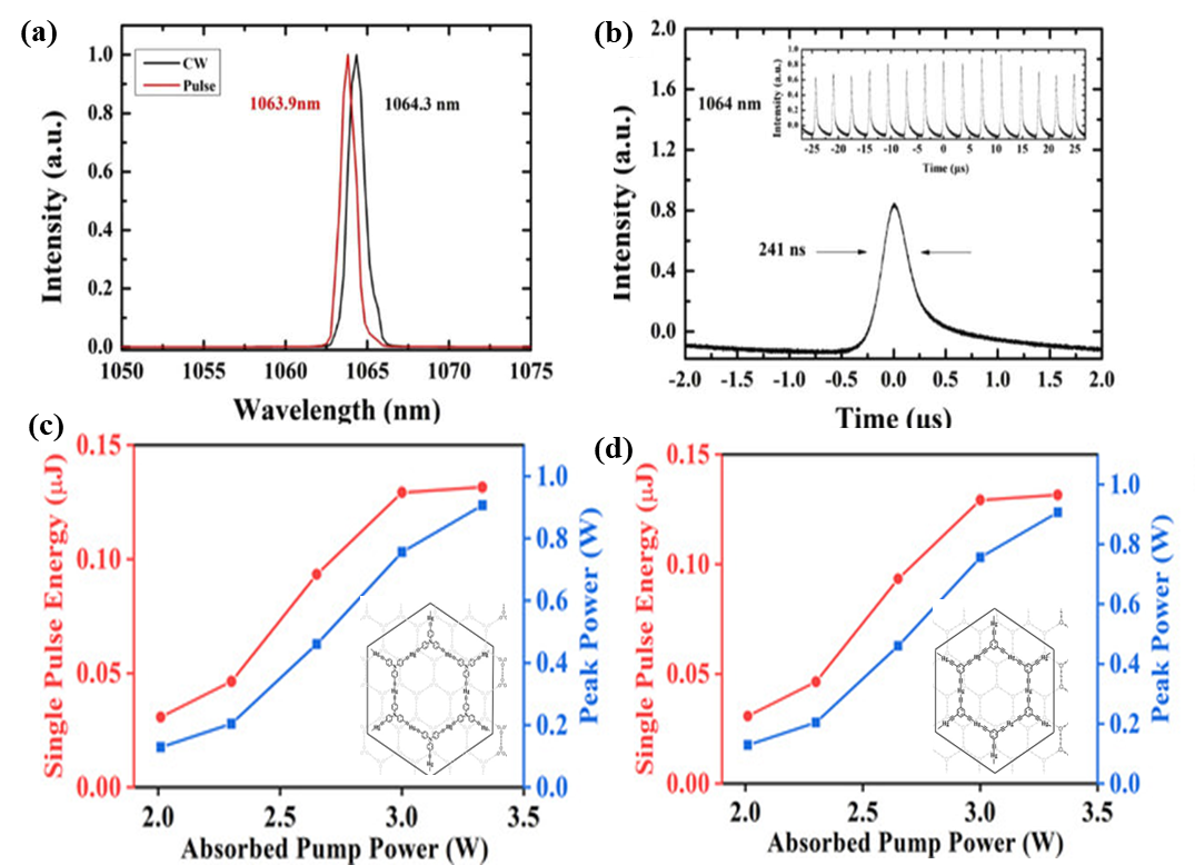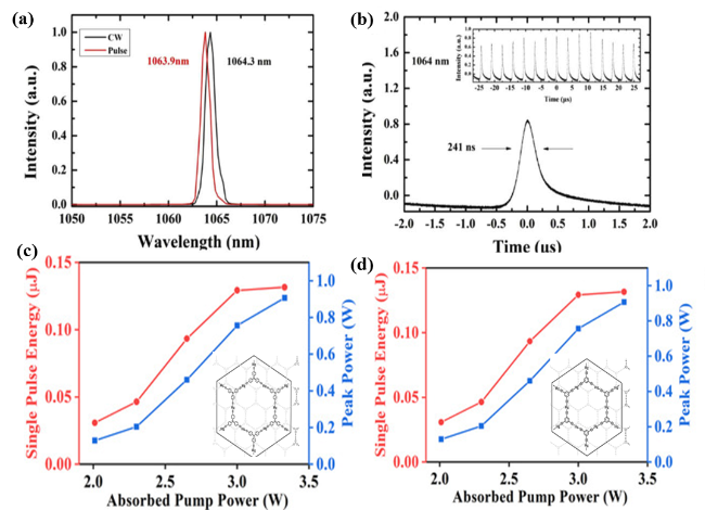 图13 (a) GY SA的CW和Q开关激光脉冲的光谱;(b)GY SA的自相关轨迹[92];(c) HgL1为SA的Q开关单脉冲能量和峰值功率;(d) HgL2为SA的Q开关单脉冲能量和峰值功率[37]Fig.13 (a) Spectra of CW and Q-switched laser pulses of GY SA; (b) autocorrelation trajectory of GY SA[92]; (c) HgL1 is the Q-switched single pulse energy and peak power of the saturable absorber; (d) HgL2 is the Q-switched single pulse energy and peak power of the saturable absorber[37] |