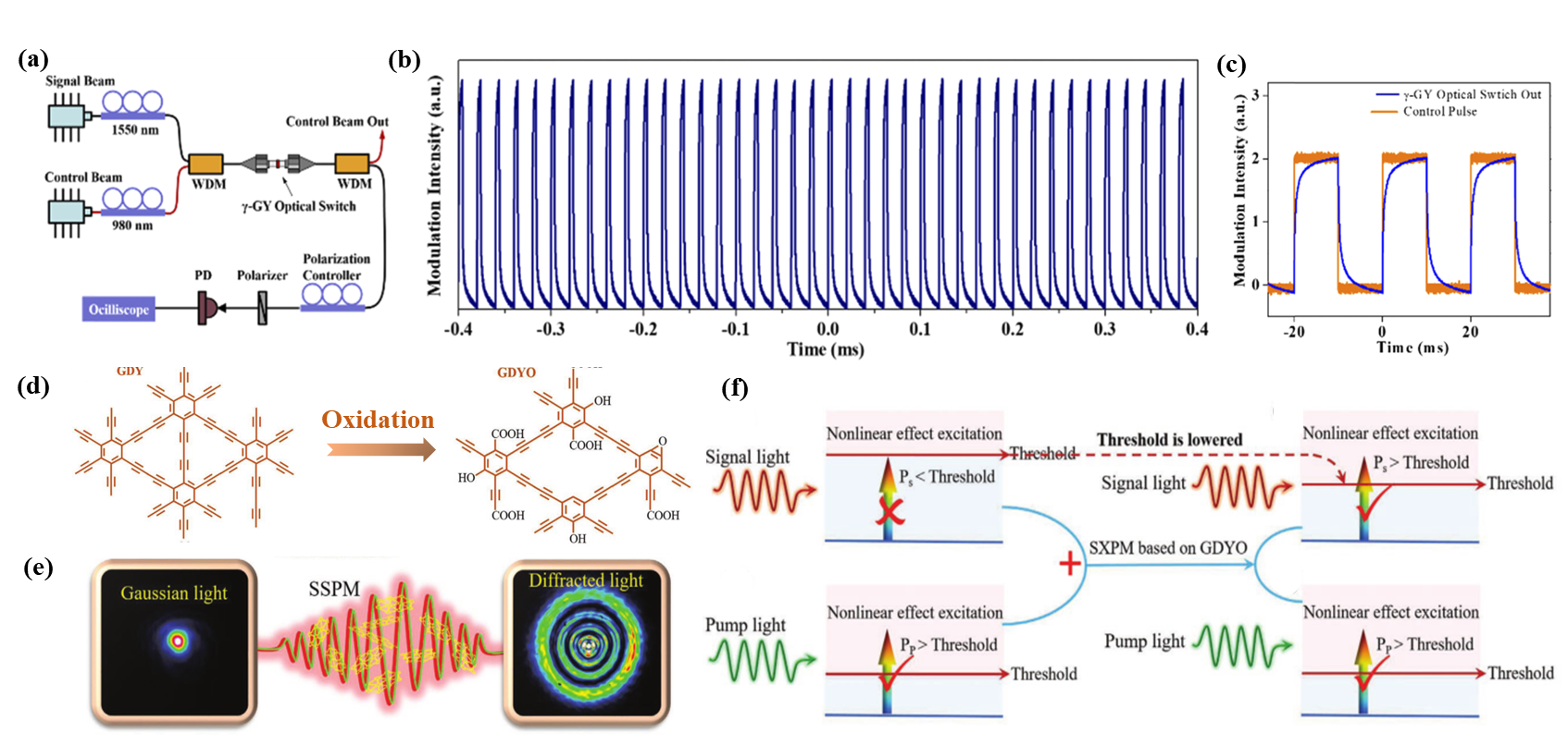 图14 (a) GY光学开关设备示意图;(b) GY光学开关的长期输出波形;(c) 信号输入与GY光学开关结果的比较图[92];(d) GDYO的化学结构式;(e) 基于SSPM的GDYO NS的非线性行为;(f) 基于SXPM的GDYO NS的非线性行为[94]Fig.14 (a) Schematic of the GY optical switch; (b) long-term output waveform of the GY optical switch; (c) plot comparing the signal input with the GY optical switching results[92]; (d) synthesis of GDYO; (e) Nonlinear behavior of the GDYO NS based on the SSPM; and (f) nonlinear behavior of the GDYO NS based on the SXPM[94] |