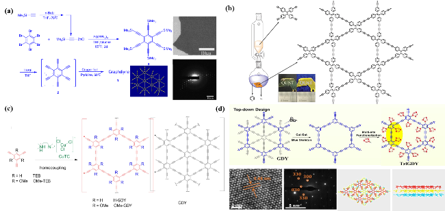 图4 (a) 铜箔生长法合成GDY反应流程图及SEM和TEM图像[11];(b) 四苯乙烯单元的荧光石墨炔衍生物薄膜的合成示意图[39];(c) OMe-GDY合成路线图[56];(d) TzlGDY合成路线、HRTEM和SAED图像[57]Fig.4 (a) Synthetic route, SEM and TEM images of GDY based on copper foil method[11]; (b) schematic diagram of the synthesis of fluorescent TPE-GDY[39]; (c) synthetic route to OMe-GDY[56]; (d) synthetic route, HRTEM and SAED images of TzlGDY[57] |