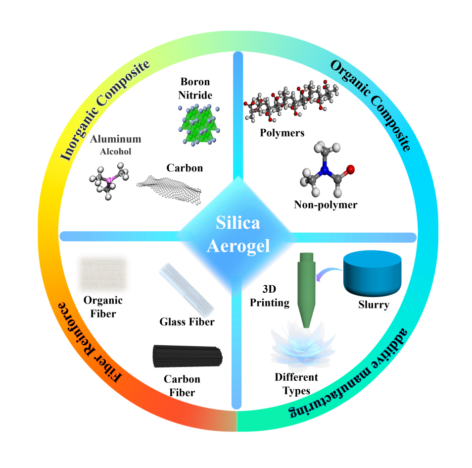Silica composite aerogels, characterized by their extremely low density, high specific surface area, and remarkable porosity, have found extensive applications in high-temperature kilns, the oil and gas sector, aerospace, and various other advanced domains. Firstly, silica aerogels that have been composited through inorganic and organic compositing were thoroughly reviewed in this paper, as well as fiber reinforcement, including a comparative analysis of their thermal conductivity, compressive strength, porosity, density, and other significant physical properties. Secondly, the most recent strategies for additive manufacturing of silica composite aerogels are summarized. Finally, the challenges related to the fabrication and performance of silica composite aerogels and proposed future research directions for their advancement was addressed by this paper.