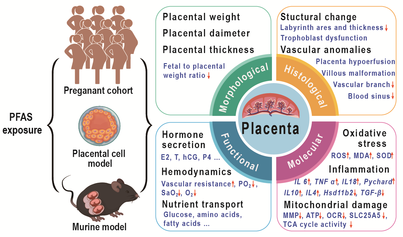 Per- and polyfluoroalkyl substances (PFAS) are a category of persistent organic pollutants (POPs) that are ubiquitously found across various environmental media, due to their extensive application in industrial processes and consumer products. These substances can infiltrate the human body through diet, drinking water, inhalation and skin contact, thereby posing potential risks to human health. The placenta, a critical organ at the maternal-fetal interface, is integral to material exchange and endocrine regulation, functioning as a natural barrier to shield the fetus from harmful external agents. Nonetheless, PFAS can cross the placental barrier, accumulate in placental tissues, and subsequently disrupt normal placental physiological functions, which poses significant threats to fetal growth and development. Based on evidence from epidemiological studies, placental cell models, and animal exposure models, this review summarizes the global exposure levels of PFAS in the placenta, examines the effects of PFAS exposure on placental morphology, structure, and function, and explores the underlying molecular mechanisms. By providing a comprehensive overview of current research, this review also offers insights into future research directions.