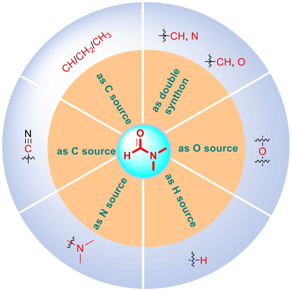 N,N-dimethylformamide (DMF) is a common organic compound. It is not only often used as a solvent in organic reactions but also widely employed as a reaction reagent in industrial production, playing an important role in organic synthesis for a long time. It is worth noting that DMF itself can act as a synthon to provide different structural units for participation in organic synthesis reactions, and it plays a very important role in the construction of complex, diverse and structurally novel functional molecules. Therefore, this review focuses on introducing the performance of DMF as a multifunctional precursor in various reactions, summarizes the latest progress of DMF as an amine source, carbon source, hydrogen source, oxygen source and double synthon reactions, and prospects the future development direction of this field, hoping to provide a reference for the later research on reactions involving DMF as a synthon.