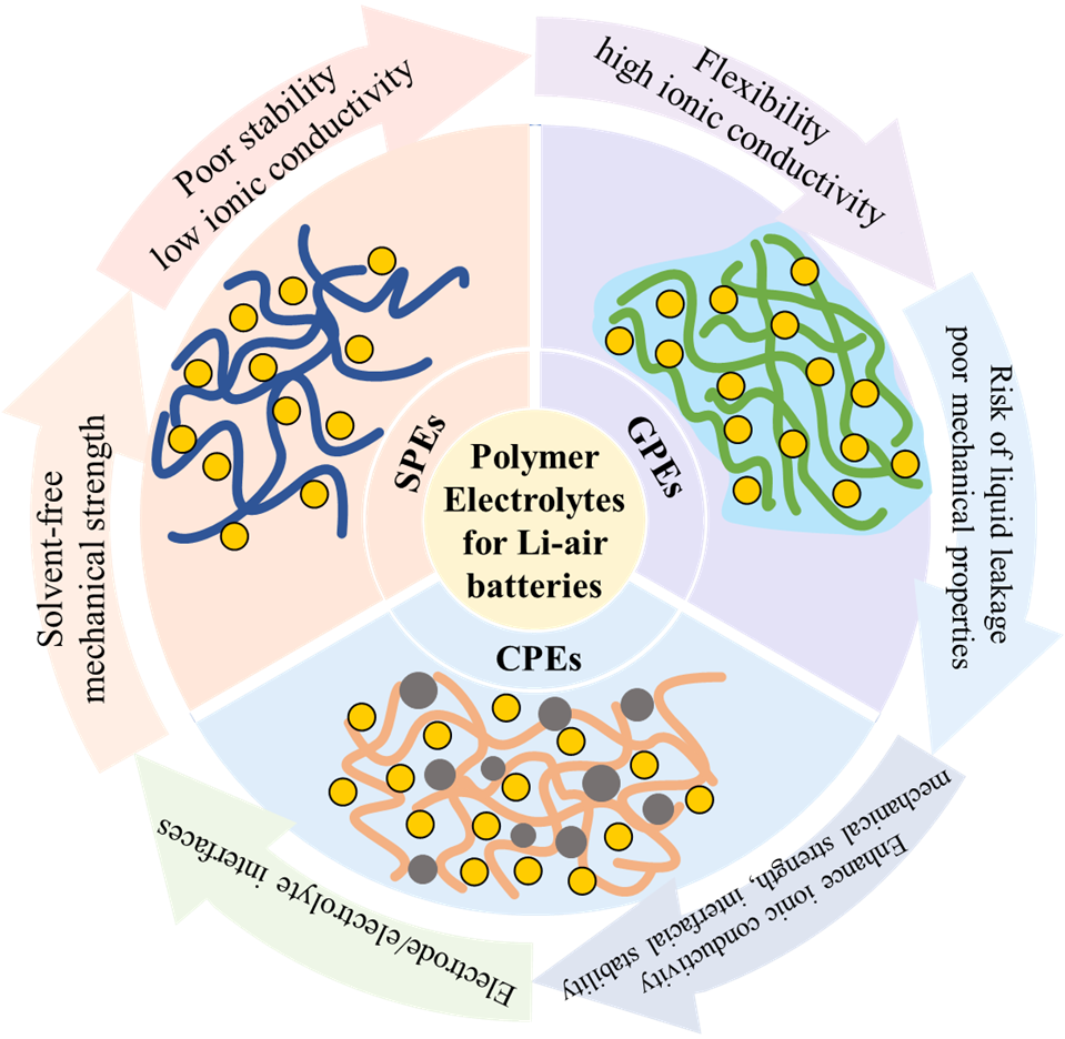 Lithium-air batteries are considered a strong candidate for next-generation electrochemical energy storage due to their exceptionally high theoretical energy density. However, the inherent issues of liquid electrolytes, such as flammability and uncontrolled lithium dendrite growth, severely restrict the safety and practical application of lithium-air batteries. Therefore, developing polymer electrolytes that combine high safety, good mechanical properties, and favorable interfacial compatibility is a critical path toward realizing practical solid-state lithium-air batteries. This review summarizes the fundamental characteristics, preparation methods, and performance in LABs of three categories of polymer electrolytes: solid polymer electrolytes, gel polymer electrolytes, and composite polymer electrolytes. A particular emphasis is placed on reviewing the roles and mechanisms of active and inert fillers in improving the polymer-filler interface, enhancing ion transport and mechanical strength, and reinforcing interfacial stability. The review concludes by summarizing the major current challenges and proposing future research directions, aiming to promote the system integration and engineering application of solid-state lithium-air batteries toward achieving high energy density and long cycle life.