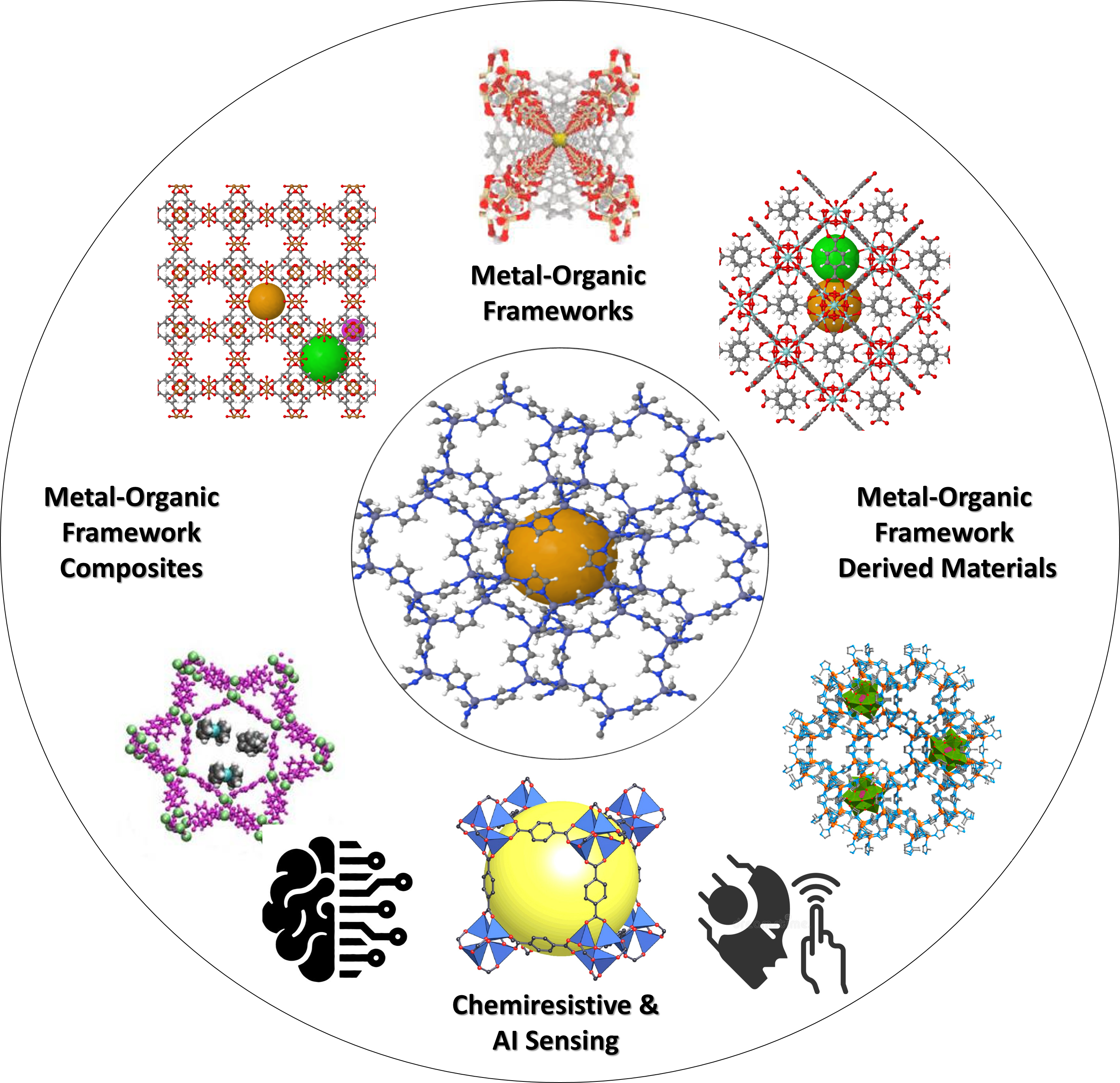 Accurate and real-time sensing is fundamental to advancements in health diagnostics, environmental monitoring, and industrial safety. However, conventional sensing materials such as metal oxides, conducting polymers, and carbon-based composites are constrained by intrinsic trade-offs between sensitivity, selectivity, and operational stability. To address these limitations, metal-organic frameworks (MOFs) have emerged as a transformative class of materials, offering unparalleled structural tunability, ultrahigh surface areas, and programmable pore chemistry. This comprehensive review provides an in-depth analysis of MOF-based chemiresistive sensors, moving beyond a simple catalog of examples to establish a mechanistic understanding of how molecular-level design dictates sensing performance. We systematically deconstruct the evolution from often-insulating pristine MOFs to advanced composites where MOFs synergize with conductive fillers like graphene, carbon nanotubes, and polymers and to MOF-derived porous carbons and metal oxides. Each category is critically examined to highlight strategies for overcoming inherent challenges in electrical conductivity, response kinetics, and long-term stability. The review is structured to guide the researcher in the field from fundamental design principles and charge transport mechanisms to performance benchmarking against key metrics such as sensitivity, limit of detection, selectivity, and response/recovery times. A significant focus is placed on the integration of MOFs into next-generation applications, including flexible and wearable electronics, multi-parameter sensor arrays, and intelligent systems that leverage artificial intelligence for pattern recognition and drift compensation. Furthermore, we critically address the pivotal challenges hindering practical deployment, such as hydrothermal/chemical stability, mechanical robustness for wearable formats, and the urgent need for standardized testing protocols. By synthesizing insights from fundamental research and cutting-edge applications, this review serves as a rational design guide and a forward-looking perspective, outlining a concrete roadmap for harnessing the full potential of MOFs in the development of intelligent, reliable, and commercially viable next-generation chemiresistive sensing technologies.