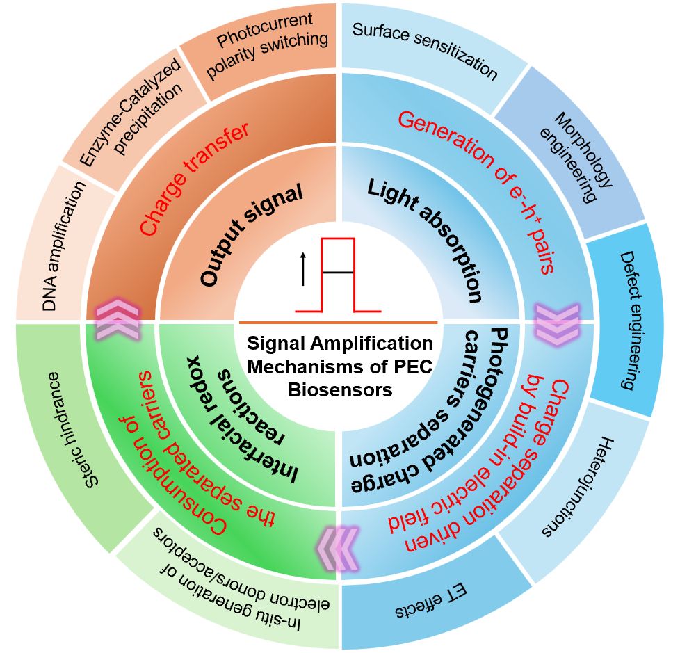 Photoelectrochemical (PEC) biosensors, as an emerging analytical platform, offer significant advantages, including low background signals, high sensitivity, and operational simplicity, due to the inherent separation of the excitation source and the detection signal. The core of achieving high performance in PEC biosensors lies in the development of efficient signal amplification strategies. This review systematically summarizes recent research progress on signal amplification mechanisms in PEC biosensors. Photoelectric †conversion constitutes the basis of PEC sensing, primarily involving three essential processes: light harvesting, charge carrier separation, and interfacial reaction. Based on this, the prevailing signal amplification mechanisms are reviewed from the core processes of photoelectric conversion to the design of signal output. Simultaneously, the design principles and characteristics of these mechanisms are delved. Finally, this review examines the challenges of PEC sensing technologies and explores future trends. This review aims to provide theoretical guidance for the rational design of high-performance PEC biosensors and to promote their further development in applications of analysis.
