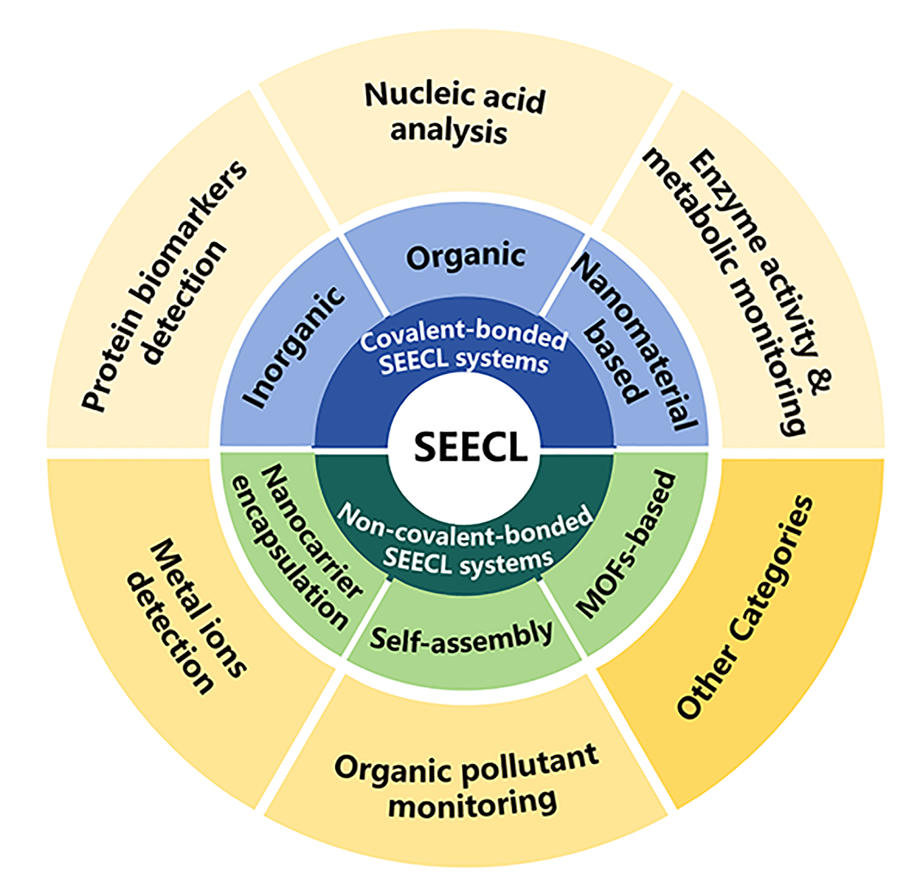 Self-enhanced electrochemiluminescence (SEECL), as an emerging analytical technique, significantly enhances electrochemiluminescence (ECL) efficiency by integrating luminophores and co-reactants into unified nanostructures or molecular frameworks, demonstrating substantial value in the fields of bioanalysis and environmental sensing. Based on the integration mode of luminophores and co-reactants, SEECL structures can be categorized into two types: covalently bonded SEECL and non-covalently bonded SEECL. Covalently bonded SEECL can be further divided into inorganic, organic, and nanoscale covalent bonding SEECL systems, while non-covalently bonded SEECL includes structures such as nanocarrier encapsulation, self-assembly, and metal-organic framework (MOF)-based SEECL. On the basis of summarizing the construction principle of SEECL, this paper summarizes its applications in areas including bioanalysis (protein biomarker detection, nucleic acid analysis, and enzyme activity monitoring), environmental sensing (trace detection of heavy metal ions and organic pollutants), food safety testing, wearable devices, and point-of-care testing (POCT). Additionally, the article addresses unresolved issues such as the stability, biocompatibility of SEECL materials and interference from complex matrices, and prospects its future development directions, providing a reference for subsequent research on SEECL.