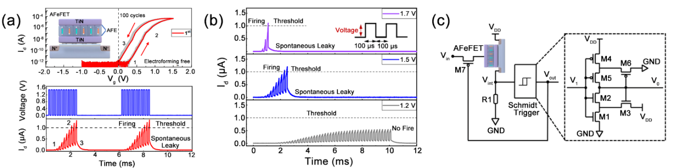 图3 基于反铁电场效应晶体管的LIF神经元[43]Fig. 3 Leaky integrate-and-fire (LIF) neuron based on antiferroelectric field effect transistor[43] (a) Volatile typical transfer curves of an antiferroelectric field effect transistor (AFeFET) (up) and continuous firing events of an AFeFET neuron under voltage pulses (down); (b) Dynamic of leaky and integration process of an AFeFET neuron under gate pulse with different amplitudes; (c) Artificial neuron circuit diagram based on AFeFET |