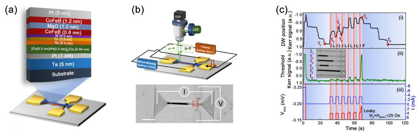 图4 基于反铁磁材料的LIF神经元[51]Fig. 4 LIF neuron based on an antiferromagnetic spintronic device[51] (a) Schematic of an antiferromagnetic spintronic device; (b) Schematic of a polar magneto-optic Kerr effect microscope setup for in-situ magneto-electrical transport probing (up) and its measured domain wall position of hall bar under current stimuli (down); (c) Domain wall position signal (up), neural threshold signal (middle) and output voltage spike dynamics (down) of the antiferromagnetic spintronic device under current stimuli with inset presenting dynamics of domain wall motion |