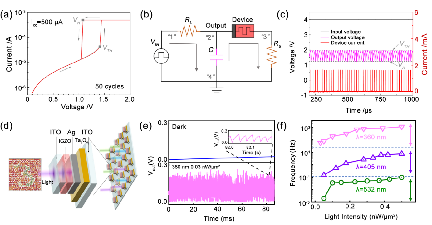 图5 氧化物忆阻器基LIF神经元研究Fig. 5 Researches of LIF neurons based on oxide memristors (a) Typical I-V curve of a NbOx-based TS memristor[63]; (b) Schematic diagram of artificial spiking neuron circuit based on NbOx-based memristor[63]; (c) Oscillation and output spiking characteristics of memristive neuron under constant voltage stimuli[63]; (d) Schematic illustration of an optoelectronic neuron with ITO/IGZO/Ag/Ta2O5/ITO structure[73]; (e) Comparison of fire dynamics of the optoelectronic neuron under dark and ultraviolet light[73]; (f) Fire frequency of the optoelectronic neuron as a function of light intensity at different wavelengths[73] |