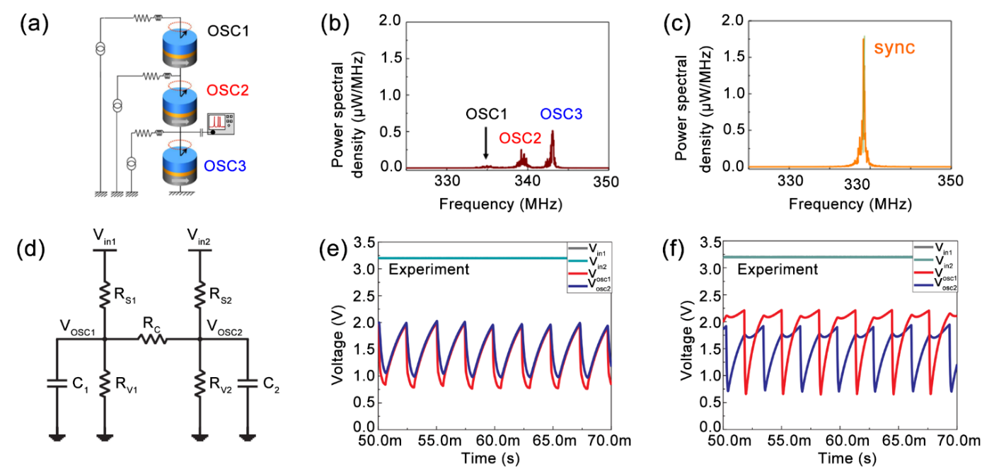 图6 振荡神经元耦合电路及其振荡波同步输出图Fig. 6 Coupling circuits of oscillation neurons and the output mutual waves (a) Circuit schematic of three spin-torque nano-oscillators connected electrically[108]; (b) Unsynchronized oscillatory wave of the three coupled oscillators[108]; (c) Synchronized oscillatory wave of the three coupled oscillators[108]; (d) Coupled circuit consisting of two VO2-based oscillators[96]; (e) In-phase voltage oscillatory waves of VO2-based coupled circuit[96]; (f) Out-of-phase voltage oscillatory waves of VO2-based coupled circuit[96] |