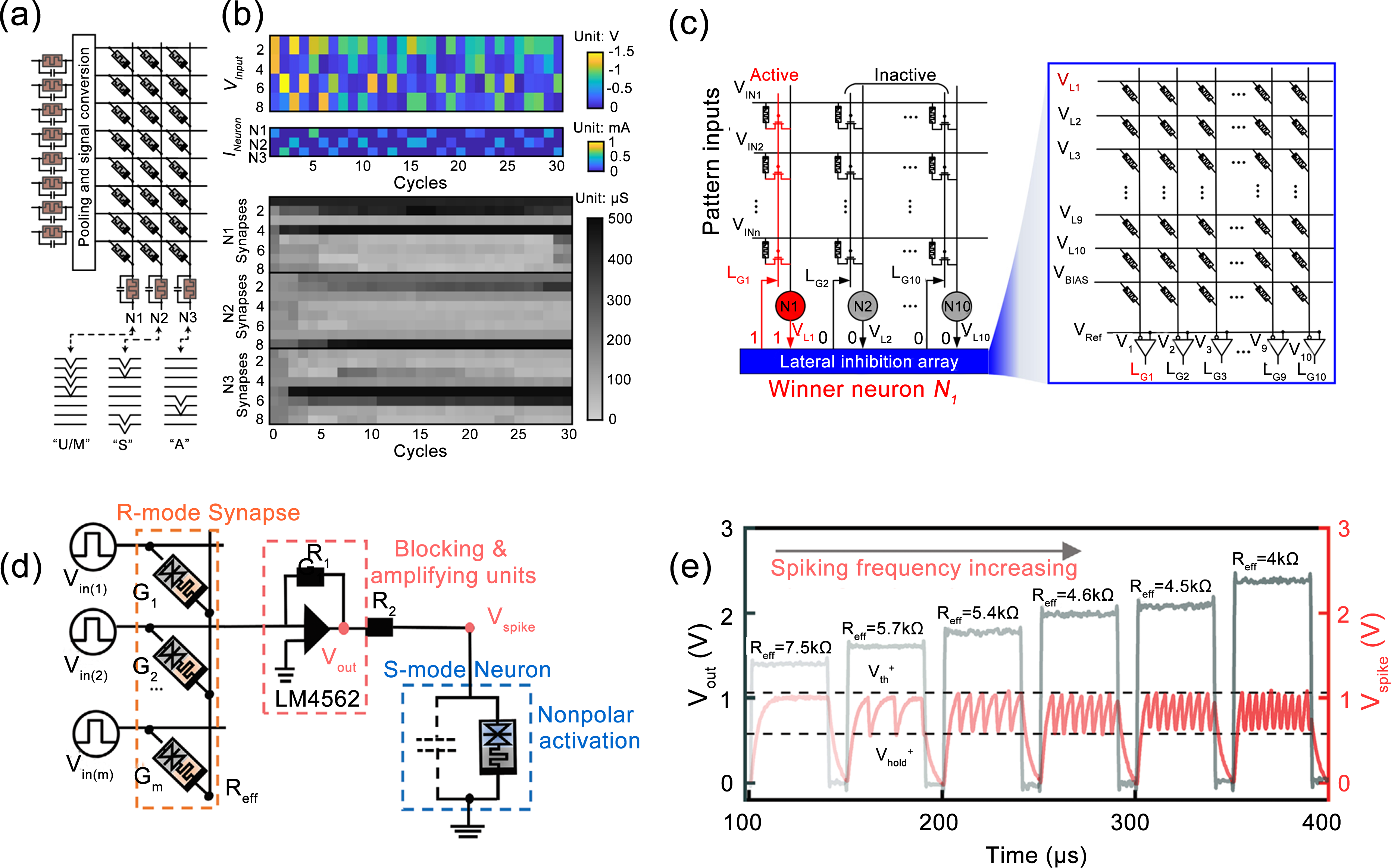 图7 基于氧化物神经元硬件的SNN研究Fig. 7 Researches on hardware implementations of spiking neural network (SNN) based on oxide neurons (a) Schematic of an SNN with 8×3 array network for unsupervised learning[116]; (b) Evolution of input voltages, neuron currents and synaptic weights in the unsupervised learning process[116]; (c) Neuromorphic circuit based on hybrid memristor/CMOS neurons[119]; (d) Circuit diagram of the V/VOx/HWOx/Pt-based SNN hardware system[120]; (e) Output spike frequency (Vout) as a function of resistance of R-mode device[120] |