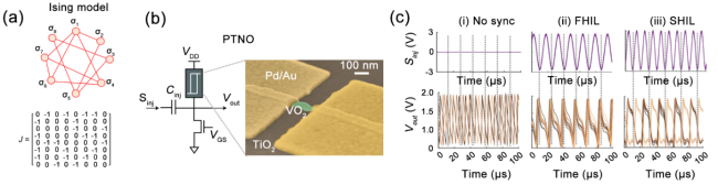 图8 基于VO2振荡神经网络的伊辛解算器[121]Fig. 8 VO2 oscillator-based oscillatory neural network (ONN) for Ising Hamiltonian solver[121] (a) Eight-node Ising model; (b) Schematic of a phase-transition nano-oscillator consisting of a VO2-based memristor in series with a transistor (left) and the scanning electron microscopy image of the VO2-based memristor (right); (c) Measured oscillatory waveforms in no-synchronization state, first-harmonic injection-locking and second-harmonic injection-locking |