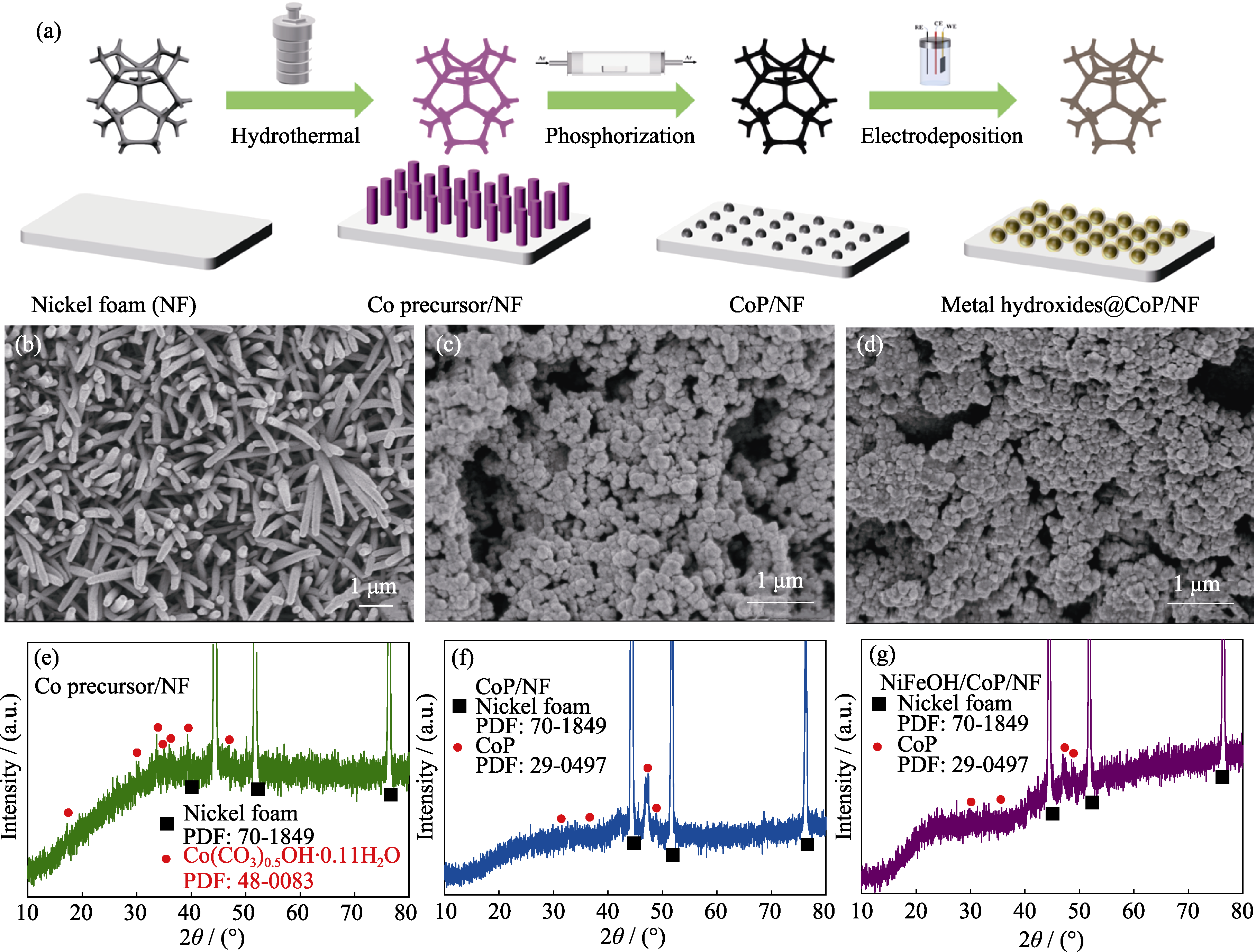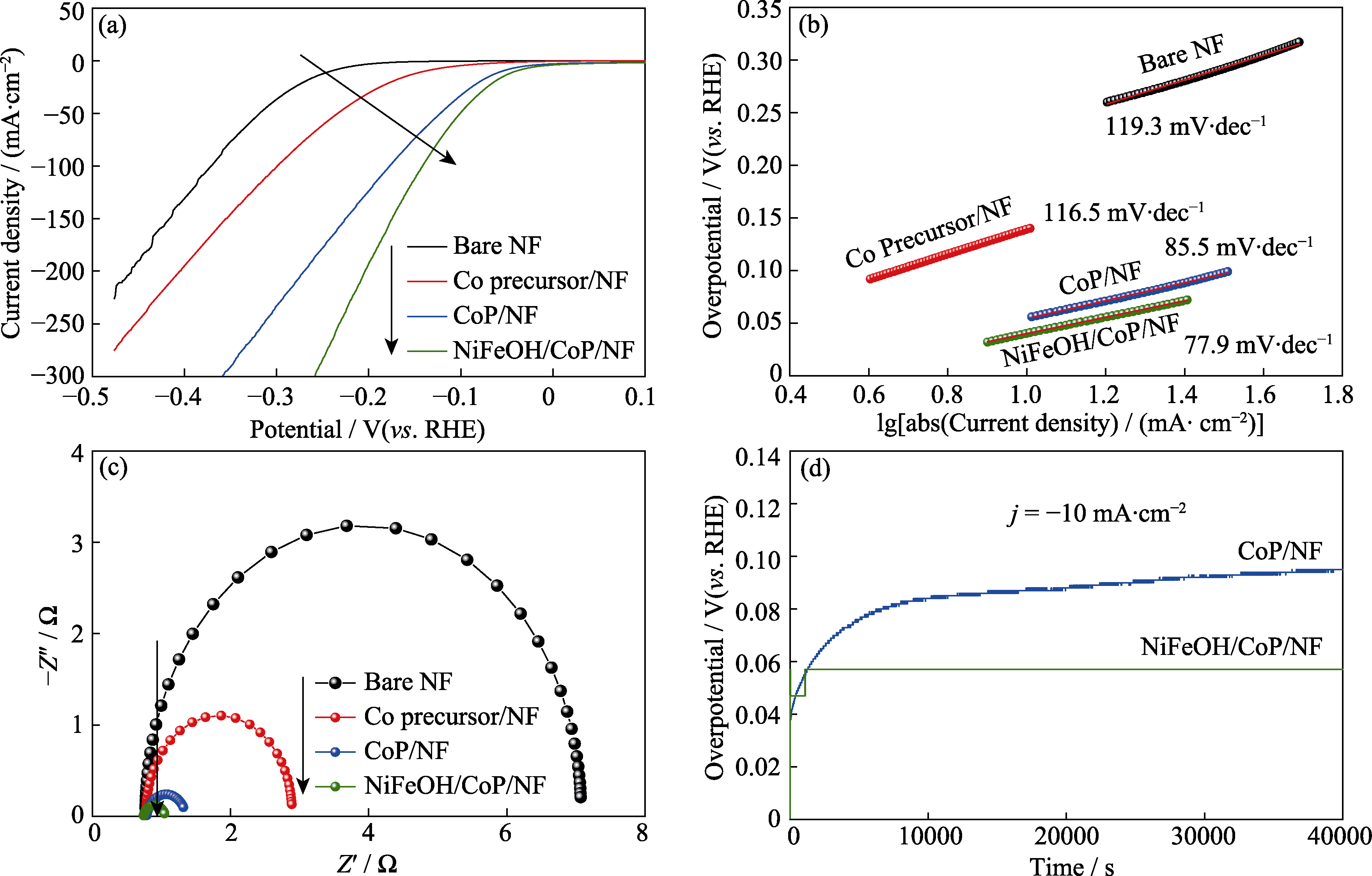 图3 单独NF、Co前驱体/NF、CoP/NF和NiFeOH/CoP/NF-200s的HER电化学性质Fig. 3 HER electrocatalytic properties of bare NF, Co precursor/NF, CoP/NF, and NiFeOH/CoP/NF-200s (a) LSV curves; (b) Corresponding Tafel plots; (c) Nyquist plots at -0.20 V (vs. RHE); (d) Chronopotentiometry plots of CoP/NF and NiFeOH/CoP/NF-200s at the current density of -10 mA/cm2 |