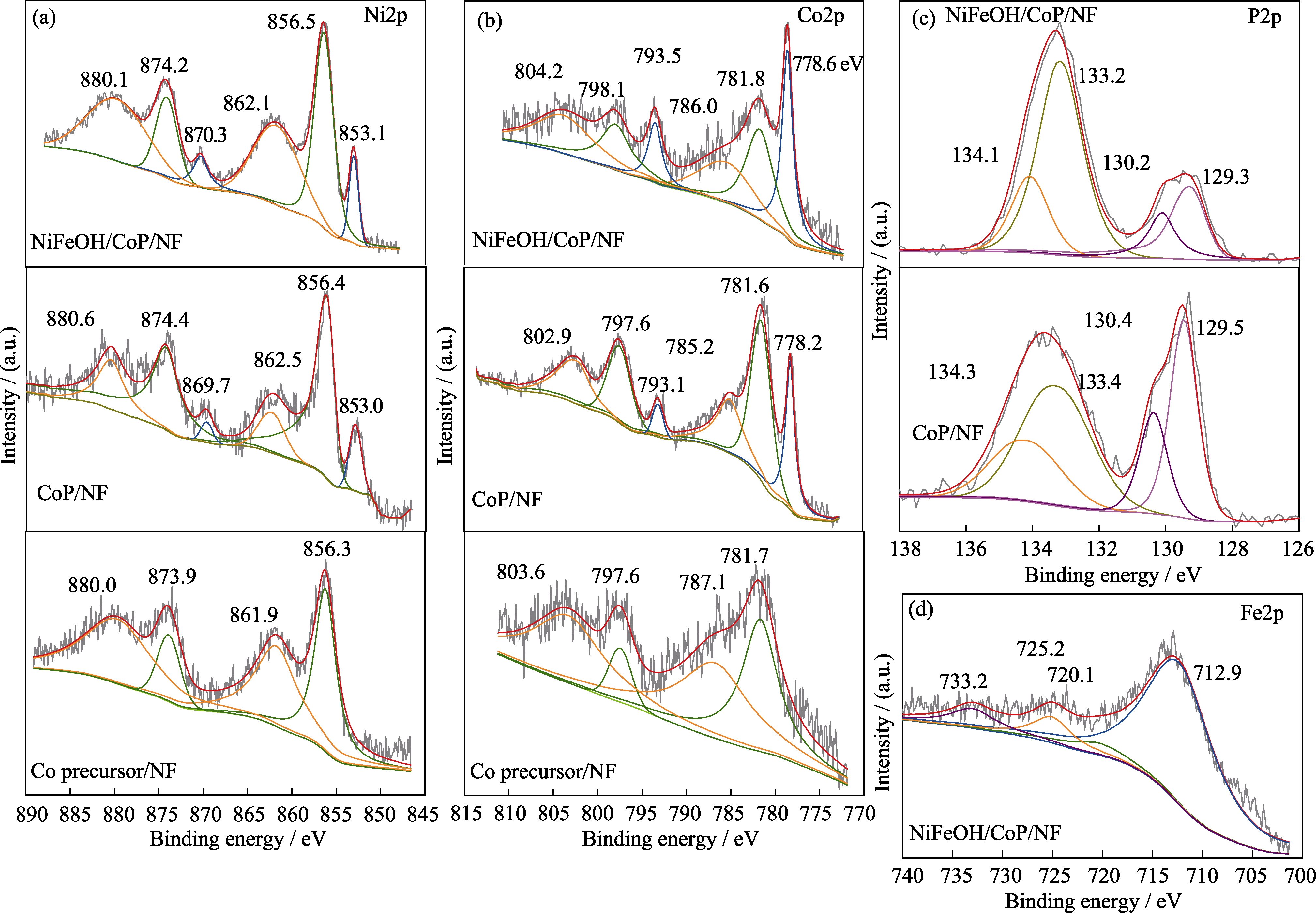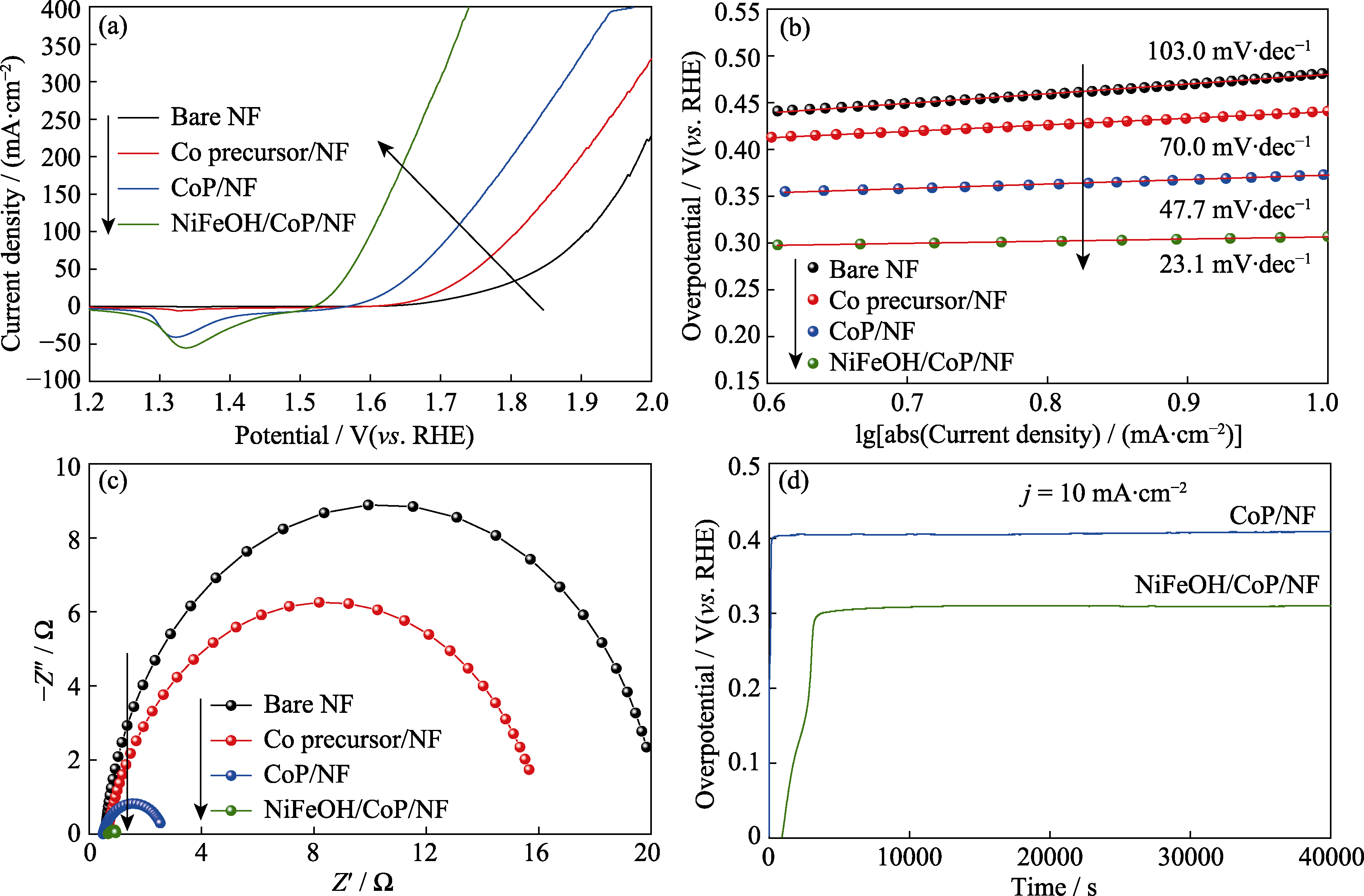 图4 单独NF、Co前驱体/NF、CoP/NF和NiFeOH/CoP/NF-200s的OER电化学性质Fig. 4 OER electrocatalytic properties of bare NF, Co precursor/NF, CoP/NF, and NiFeOH/CoP/NF-200s (a) LSV curves; (b) Corresponding Tafel plots; (c) Nyquist plots at the potential of 1.60 V (vs. RHE); (d) Chronopotentiometry plots of CoP/NF and NiFeOH/CoP/NF-200s at the current density of 10 mA/cm2 |