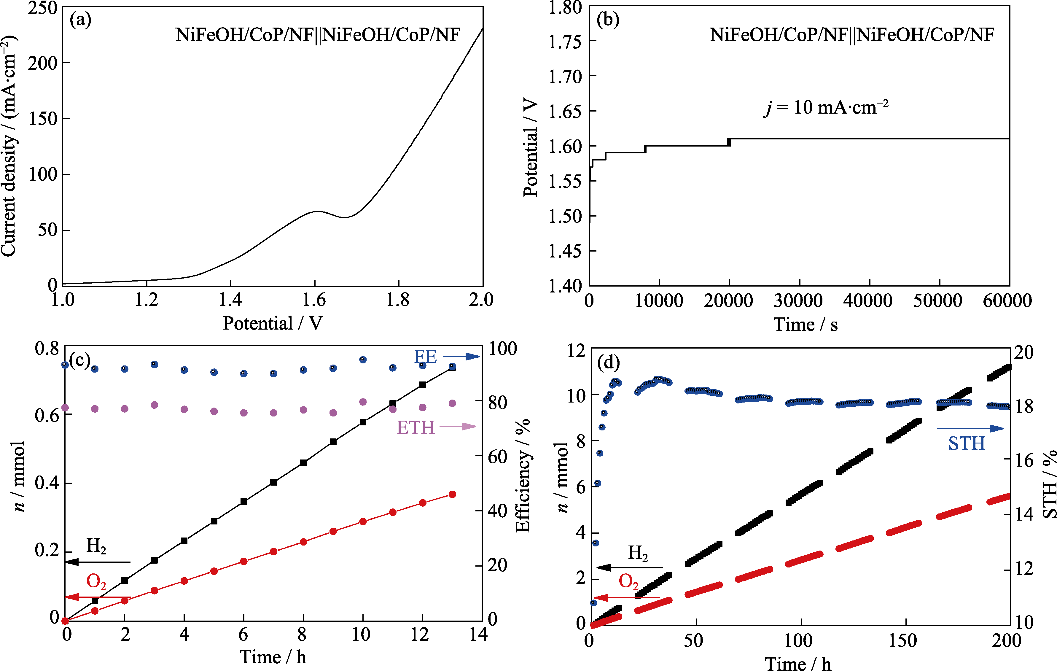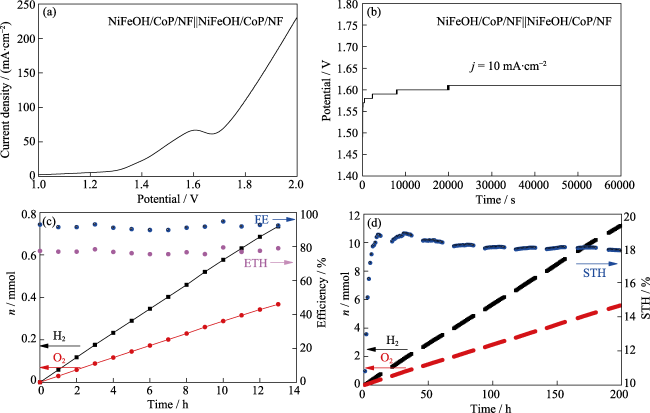 图5 NiFeOH/CoP/NF-200s||NiFeOH/CoP/NF-200s两电极全分解水的电化学性质, 以及两电极电解池与GaAs太阳能电池组成光伏-电催化系统的太阳能制氢效率Fig. 5 Electrocatalytic overall water splitting properties of NiFeOH/CoP/NF-200s||NiFeOH/CoP/NF-200s two electrode system and hydrogen production efficiency of the photovoltaic-electrocatalytic system consisting of two electrode cell and GaAs solar cell (a) LSV curve; (b) Long term chronopotentiometry plot at current density of 10 mA/cm2; (c) Galvanostatic electrocatalytic hydrogen and oxygen evolution curves, Faradic efficiency (FE), and electricity to hydrogen efficiency curves (ETH); (d) Hydrogen, oxygen evolution and corresponding solar to hydrogen efficiency curves of a photovoltaic-electrocatalytic system consisting of NiFeOH/CoP/NF-200s||NiFeOH/CoP/NF-200s electrocatalytic cell and GaAs solar cell |