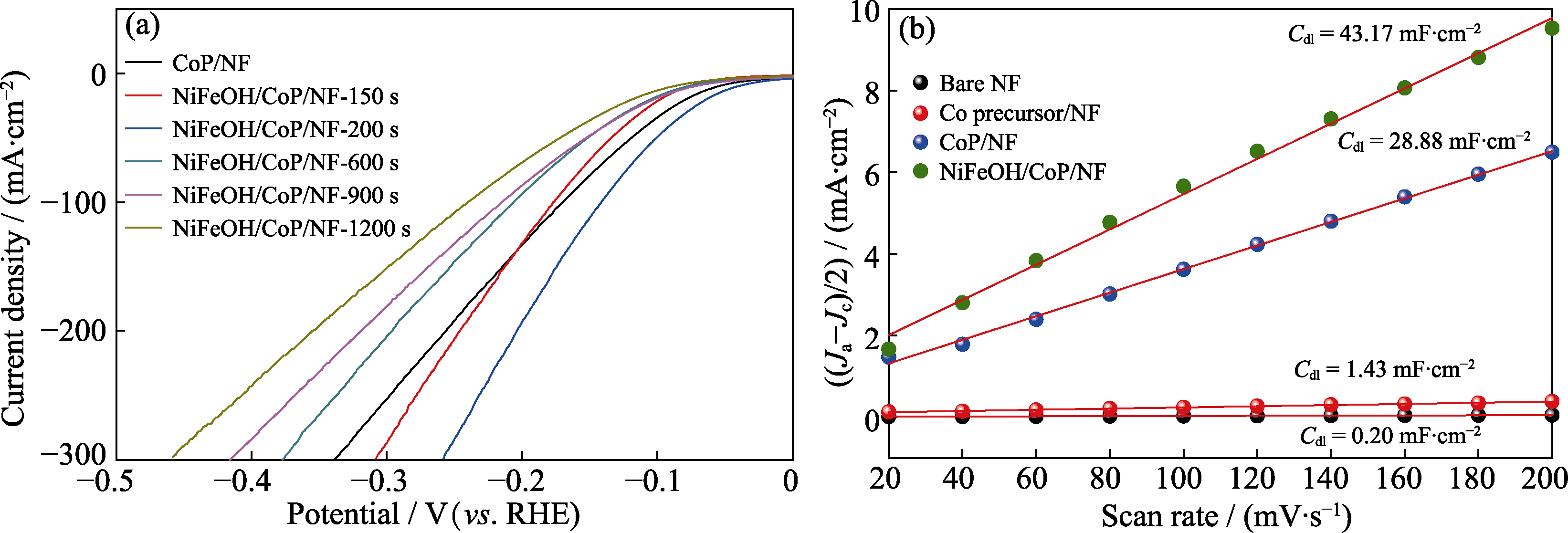 图S2 CoP/NF和不同电沉积时间制备的NiFeOH/CoP/NF-xs的阴极LSV曲线(a), 电流密度差对扫描速率作图计算单独NF、Co前驱体/NF、CoP/NF和NiFeOH/CoP/NF-200s的双层电化学电容(b)Fig. S2 Cathode LSV curves of CoP/NF, and NiFeOH/CoP/NF-xs prepared with different electrodeposition time (a), and current density difference versus scan rate to calculate the double layer capacities (Cdls) of bare NF, Co precursor/NF, CoP/NF, and NiFeOH/CoP/NF-200s (b) |