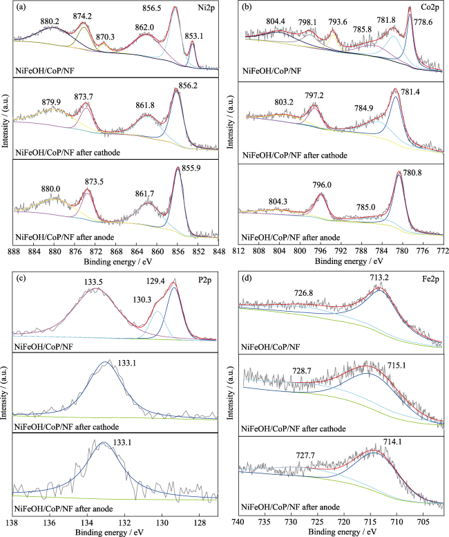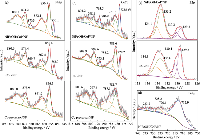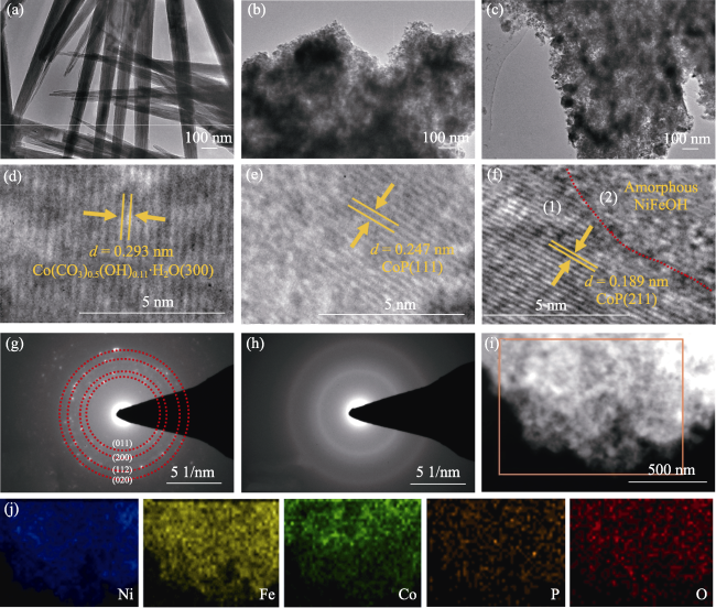 图S1 Co前驱体/NF、CoP/NF和NiFeOH/CoP/NF-200s的TEM表征Fig. S1 TEM characterization of Co precursor/NF, CoP/NF, and NiFeOH/CoP/NF-200s (a-c) TEM images of (a) Co precursor/NF, (b) CoP/NF, and (c) NiFeOH/CoP/NF-200s; (d-f) HRTEM images of (d) Co precursor/NF, (e) CoP/NF, and (f) NiFeOH/CoP/NF-200s; (g, h) SAED images in crystalline (1) and amorphous (2) areas of (f); (i) HAADF-STEM image and (j) Ni, Fe, Co, P, O element mappings of NiFeOH/CoP/NF-200s |
