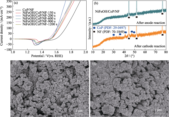图S3 CoP/NF和不同电沉积时间制备的NiFeOH/CoP/NF-xs电极的阳极LSV曲线(a)及NiFeOH/CoP/NF-200s阴、阳极恒电流反应后的XRD和SEM表征(b~d)Fig. S3 Anode LSV curves of CoP/NF and NiFeOH/CoP/NF-xs prepared with different electrodeposition time (a), XRD and SEM characterization of NiFeOH/CoP/NF-200s after cathode and anode chronopotentiometry test (b-d) (b) XRD spectra after HER and OER; (c) SEM image after HER; (d) SEM image after OER |