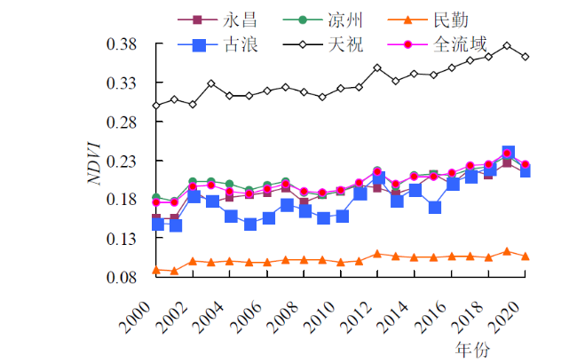 罗晓玲, 杨梅, 李岩瑛, 等. 基于NDVI的石羊河流域植被演变特征及其对沙尘暴的影响分析[J]. 水土保持学报, 2022, 36(2):84-91.