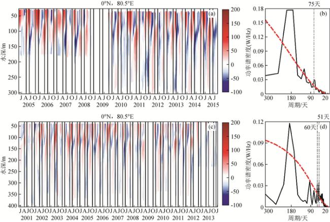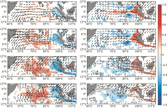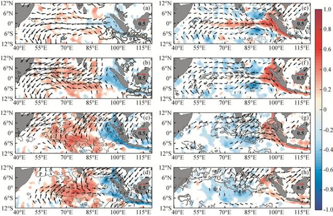 图1 (a) 0°N,80.5°E RAMA浮标纬向流(单位:cm/s),黑色框标注了春季(4—5月)和秋季(10—11月);(b)为(a)上100 m平均纬向流的功率谱;(c,d)同(a,b),为0°N,90°E结果(a)—(h)依次代表滞后时间为-20天至+15天,只保留了能够通过95%置信度检验的部分(参考Iskandar和McPhaden(2011)文章内容重绘). Fig 1 (a) Zonal current data from RAMA buoy located at 0°N, 80.5°E (unit: cm/s), the black boxes indicate April—May and October—November; (b) is the power spectrum of the zonal current averaged in the upper 100 m; (c, d) are same as (a, b), but for RAMA buoy located at 0°N, 90°E |