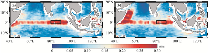 图3 (a) 北半球春季(4—5月)和(b)秋季(10—11月)0~30 m垂向平均纬向流季节内信号标准差的水平分布(单位:m/s)黑色框为Wyrtki急流存在显著季节内变化的海域. Fig 3 (a) Standard deviation of intraseasonal zonal current (unit: m/s) averaged in the upper 30 m during boreal spring (April—May) and (b) fall (October—November) The black boxes indicate areas with significant intraseasonal variabilities. |