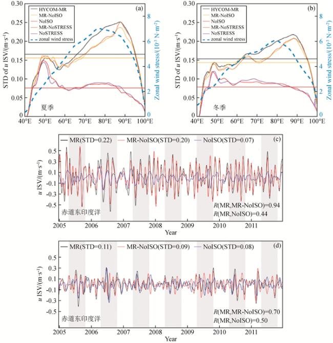 图4 (a) 北半球夏季(5—10月)季节内表层纬向流(单位:m/s)标准差沿赤道的分布,纬向流取5~50 m、2°S—2°N范围内的平均值,黑色线为考虑所有因素的HYCOM模式结果,黄色线表征大气季节内振荡的作用,红线表征海洋内部不稳定性的作用,橙色线表征季节内风应力的作用;(b)同(a),但为冬季(11—4月)的结果;(c)2°S—2°N、80°E—90°E区域5~50 m平均季节内表层纬向流的时间序列,黑色线为考虑所有因素的HYCOM模式结果,红色线表示相同情况下仅由大气季节内振荡作用产生的季节内表层纬向流,蓝色线表示相同情况下仅由海洋内部不稳定性作用产生的季节内表层纬向流,灰色阴影部分表示北半球夏季(5—10月);(d)同(c), 但为2°S—2°N、45°E—55°E区域的结果(引自Zhong等(2022))Fig 4 (a) The standard deviations of the intraseasonal zonal current (unit: m/s) along the equator during boreal summer (May—October). The intraseasonal zonal current is averaged over 5~50 m, 2°S—2°N. The black line represents the result of the HYCOM model considering all factors, the yellow line represents the role of intraseasonal atmospheric oscillations, the red line represents the role of oceanic internal instabilities, and the orange line represents the role of intraseasonal wind stress; (b) is the same as (a), but for data during boreal winter (November—April); (c) Time series of the intraseasonal zonal current averaged over 5~50 m, 2°S—2°N, 80°E—90°E from the HYCOM model considering all factors (black line). The red line represents the intraseasonal zonal current generated solely by the intraseasonal atmospheric oscillations under the same conditions, while the blue line represents the intraseasonal zonal current generated solely by the oceanic internal instabilities. Gray shading indicates boreal summer (May—October); (d) is same as (c), but for the result averaged over 2°S—2°N, 45°E—55°E (Cited from Zhong et al., 2022) |