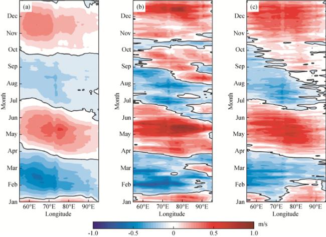 图5 (a) 气候态日平均强迫场驱动产生的赤道印度洋表层纬向流(2°N—2°S平均, 单位:m/s)经度-时间变化图;(b)同(a), 为2013年日平均强迫场驱动的结果;(c)同(b),但是在强迫场中滤除了季节内信号(引自Duan等(2016))Fig 5 (a) Time-longitude diagram of simulated surface zonal current (averaged over 2°N—2°S with unit m/s) along the equatorial Indian Ocean forced by daily forcing fields from climatology; (b) is same as (a), but for the results from models forced by daily forcing fields from 2013;The forcing fields in (c) are same as those in (b) except for subtracting signals of intraseasonal atmospheric oscillation (Cited from Duan et al., 2016) |