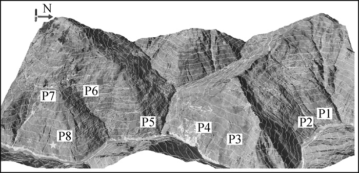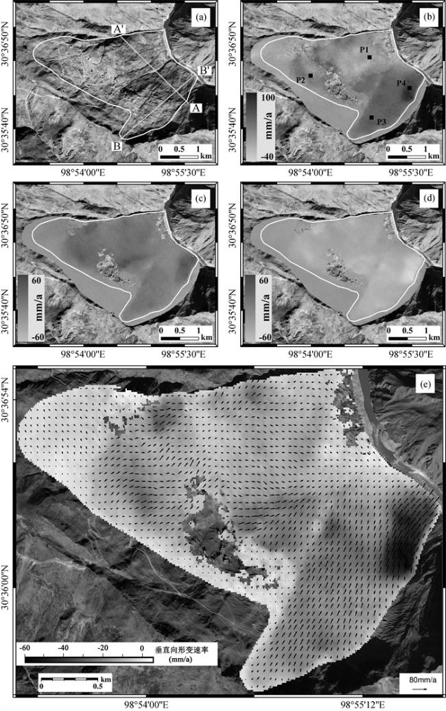 为地表平行流约束.VN、VE和VU分别为待求的南北向、东西向和垂直向形变速率,通过奇异值分解(SVD)可以求得.图7 三维形变速率(a)光学影像;(b)南北向形变速率;(c)东西向形变速率;(d)垂直向形变速率;(e)沙东滑坡水平运动矢量. Fig 7 Three-dimensional displacement rate (a) Optical image; (b) North-south displacement rate; (c) East-west displacement rate; (d) Vertical displacement rate; (e) The horizontal movement vector of the Shadong landslide. |