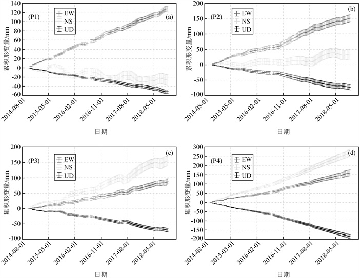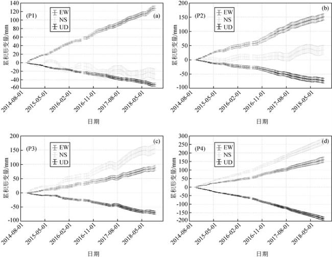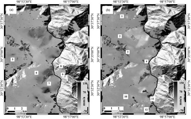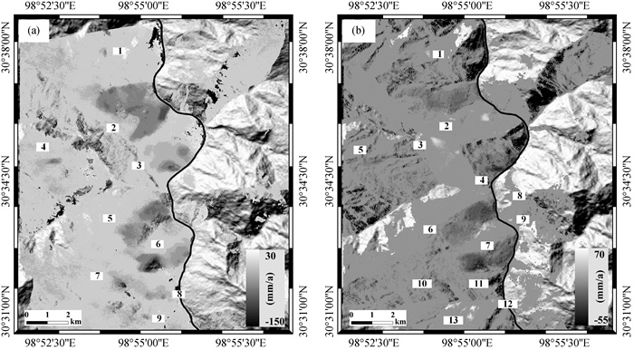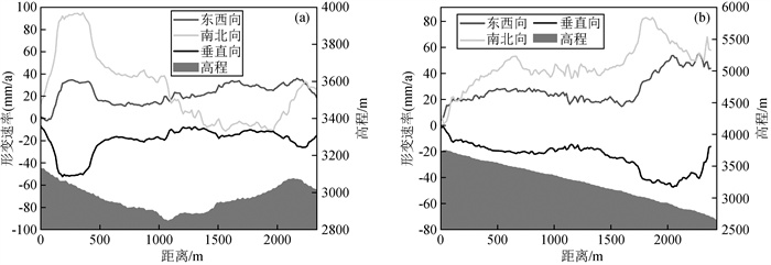 图8 沿剖线AA′(a)和BB′(b)的三个分量的形变速率和高程Fig 8 Deformation rate and elevation of the three components along the section lines AA′(a) and BB′ (b) |