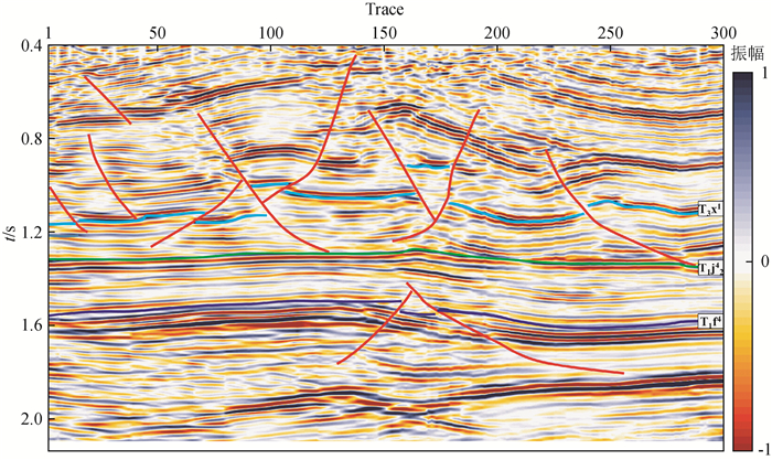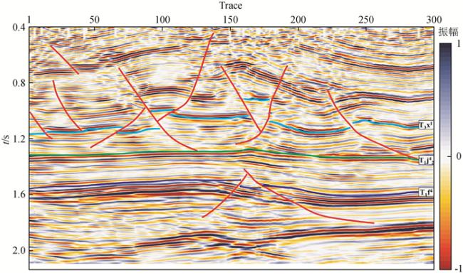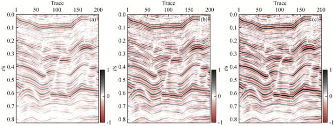 图5 地震剖面预处理前后对比(a)原始剖面;(b)弱振幅增强后;(c)滤波处理后. Fig 5 Seismic sections comparison before and after preprocessing (a) Original section; (b) After weak amplitude enhancement; (c) After filtering. |