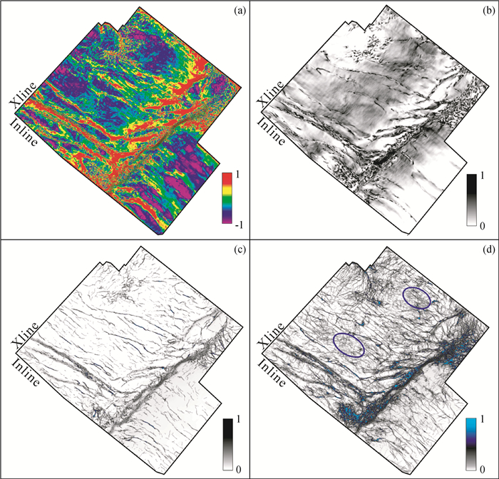 图4 研究区沿须家河组底界面的地震属性切片(a) 最大正曲率;(b) 相干;(c) 基于方差的蚂蚁体;(d) 基于最大正曲率的蚂蚁体. Fig 4 The seismic slices extracted from the bottom of Xujiahe in the study area (a)Most positive curvature; (b) Coherent; (c) The ant-tracking based on variance; (d) The ant-tracking based on most positive curvature. |
