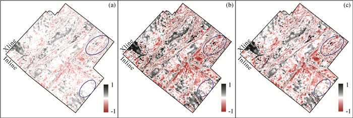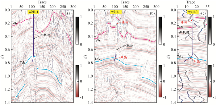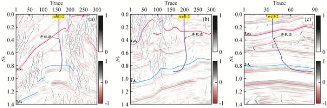 图8 过well-1井不同方向上最大似然属性在地震剖面的叠合显示(a)Inline方向;(b)Xline方向;(c)设计的井轨迹方向. Fig 8 The display of maximum likelihood attribute overlay in seismic section from different directions across through the well-1 (a) Inline direction; (b) Xline Direction; (c) Direction of designed drilling trajectory. |