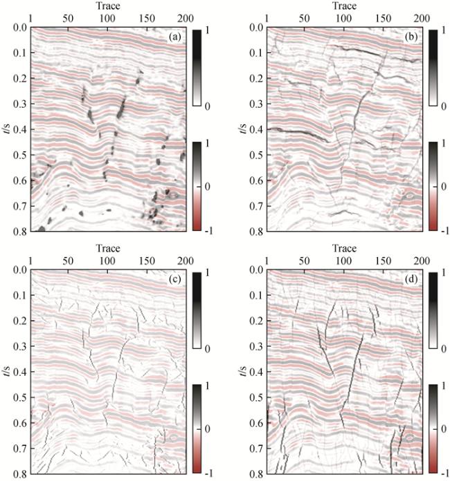 图7 地震剖面与不同方法技术预测的属性融合显示(a)基于倾角的相干;(b)基于方差的蚂蚁体;(c)未经构造导向滤波的似然属性(指数n=8);(d)本文方法(指数n=8). Fig 7 The fusion of attributes predicted by different methods with seismic section (a) The coherent based on dip; (b) The ant-tracking based on variance; (c) The likelihood attribute before structure-oriented filtering; (d) The proposed method. |