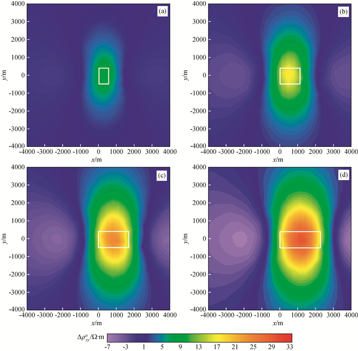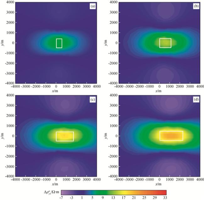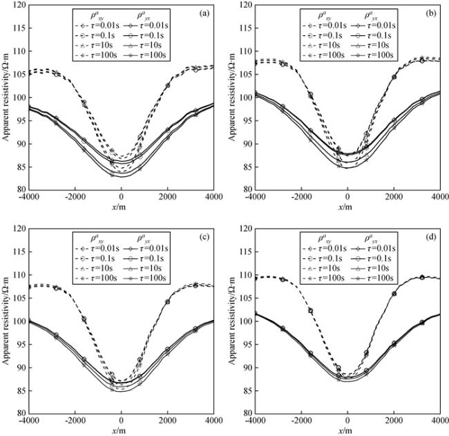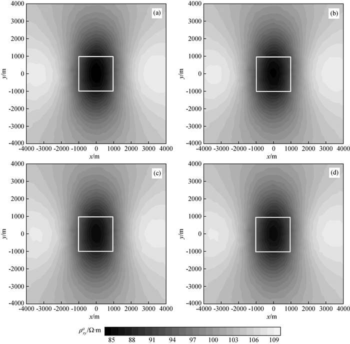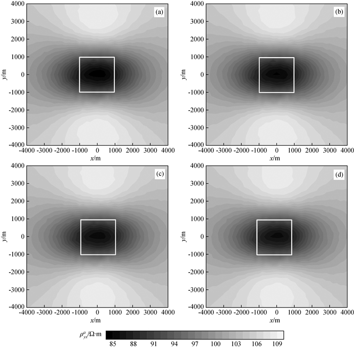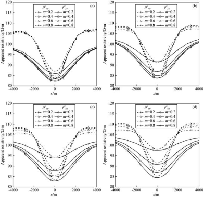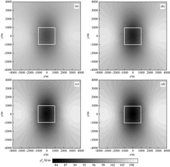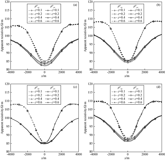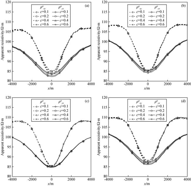 图12 频率10-2 Hz视电阻率ρxya等值线图Fig 12 Contour maps of apparent resistivity ρxya at frequency 10-2 Hz (a)c=0.6; (b)c=0.4; (c)c=0.2; (d)c=0.1. |