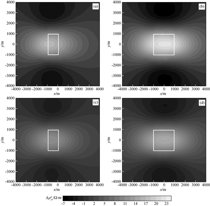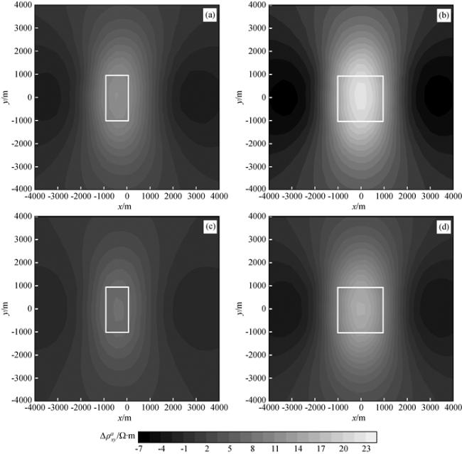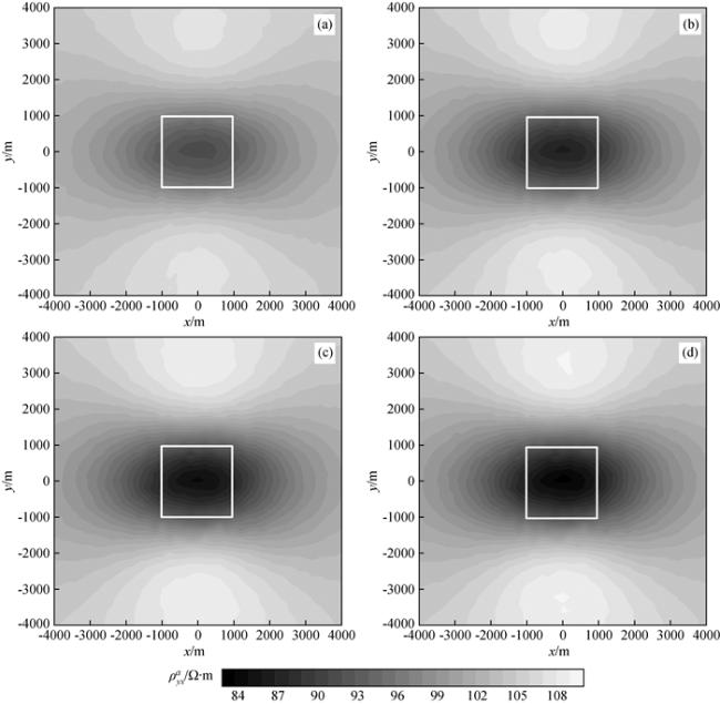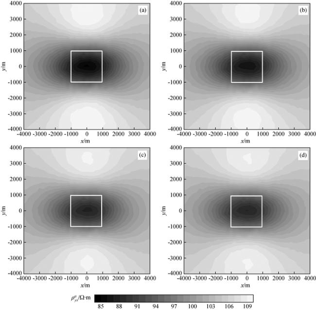 图9 频率10-2 Hz视电阻率ρxya等值线图Fig 9 Contour maps of apparent resistivity ρxya at frequency 10-2 Hz (a)τ=102 s; (b)τ=101 s; (c)τ=10-1 s; (d)τ=10-2 s. |